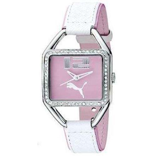 This is a PUMA Pliancy Watch. The watch shape is square with a Puma Cat logo and a two-marker pink dial and a stainless steel jeweled case. The watch has a white and pink leather strap with a buckle closure and with a band width of 17 mm. The watch Case diameter is 34 mm and Case thickness is 9.5 mm. Watch movement is quarts and is water resistant up to 165 feet (50 M).