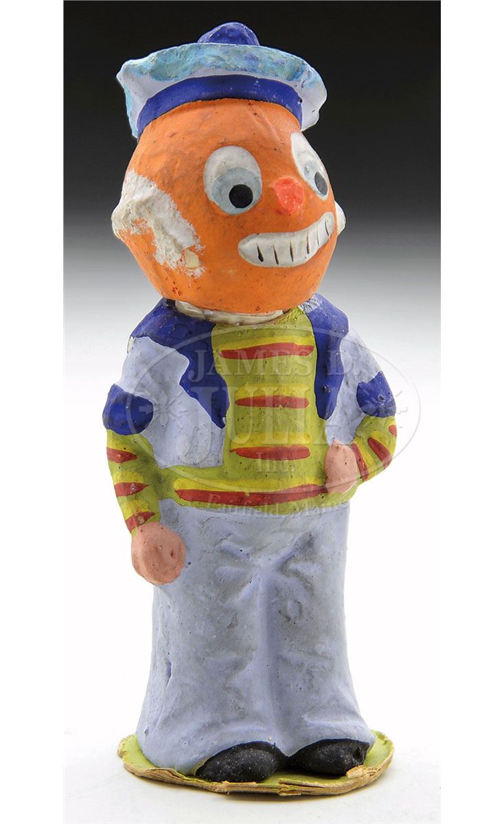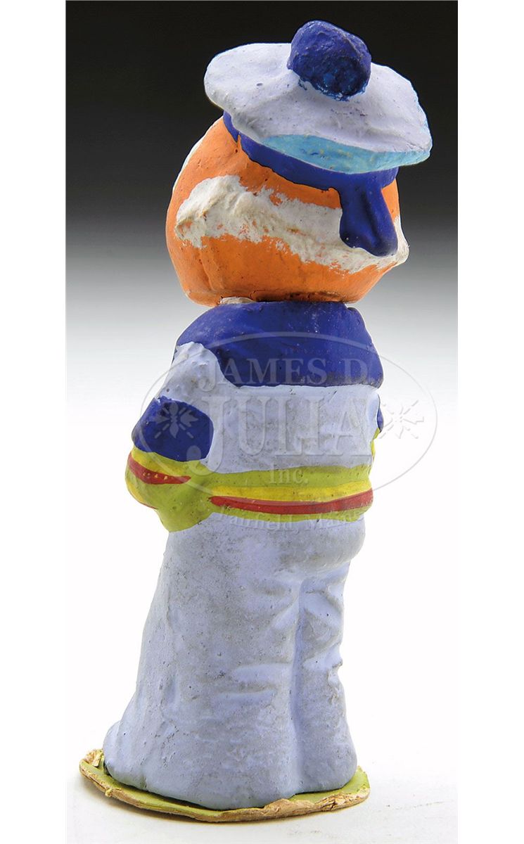 Pumpkin faced composition figure dressed in Sailor's outfit. Head removes to show candy enclosure. Probably German. SIZE: 4-1/2" t. CONDITION: Chips on leading edge of hat and nose. Repairs to neck area. Colors remain original and clean. 1-13374