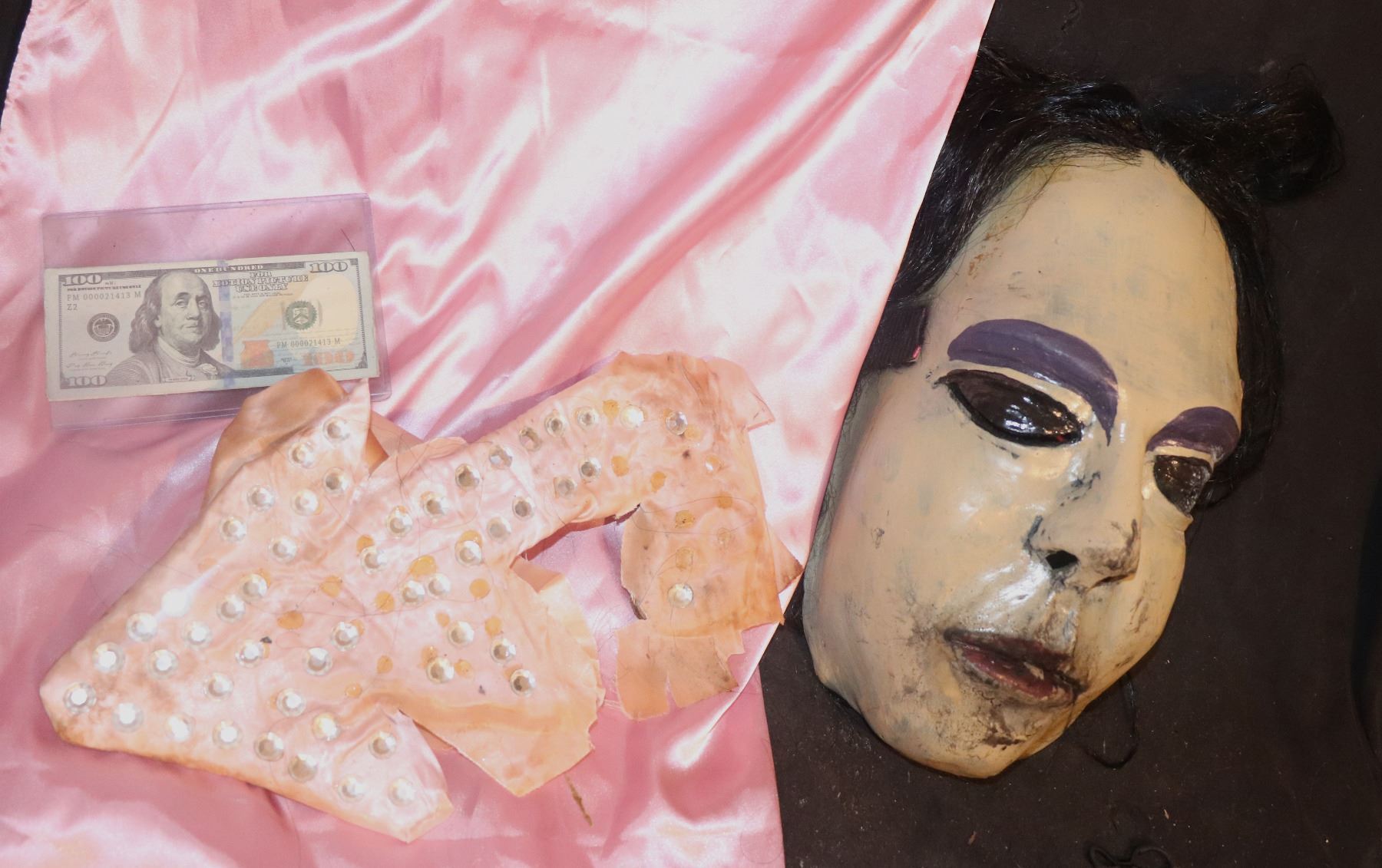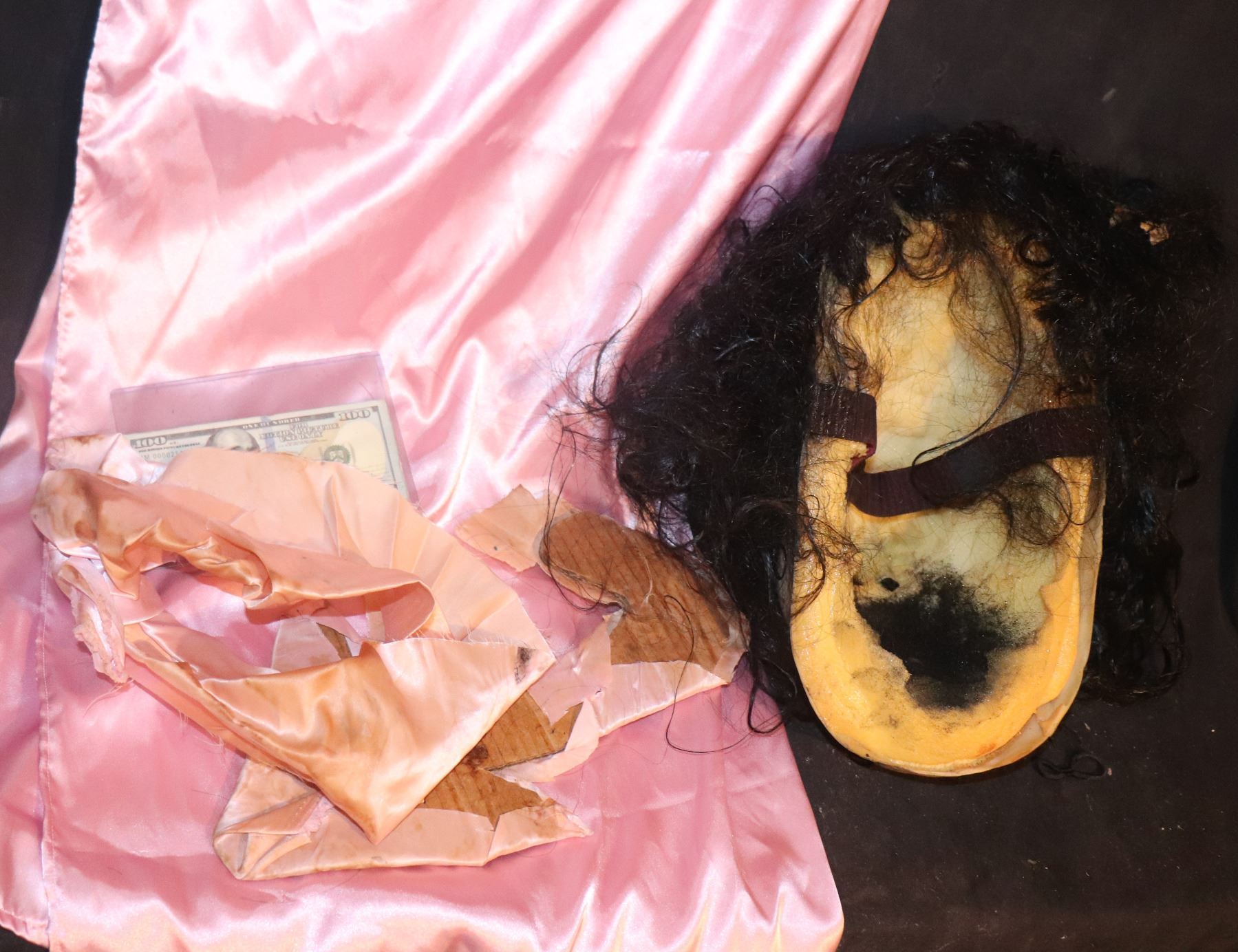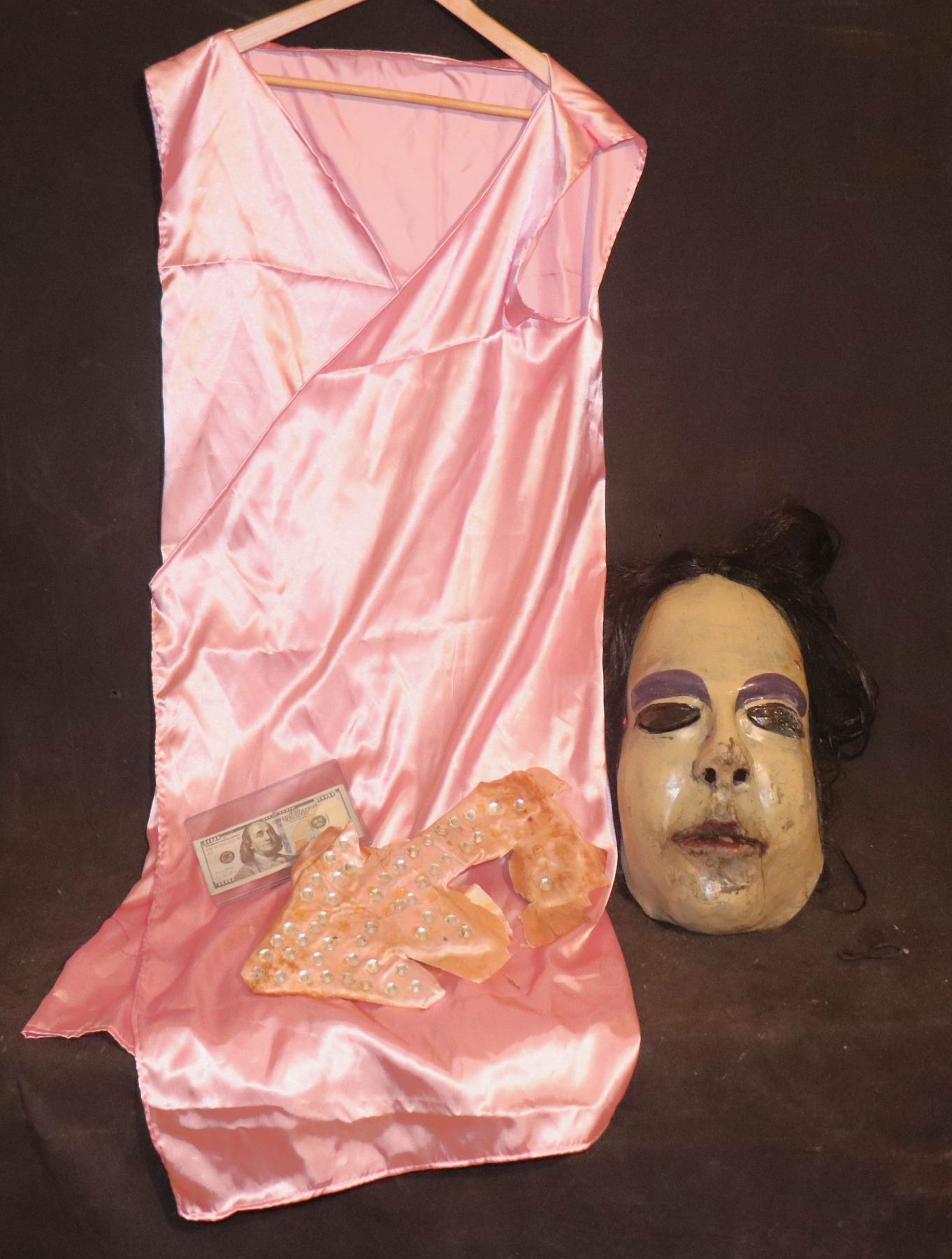 This costume includes the Full Head Mask with with hair, Dress, and the Sash that holds the dress together. Arms and legs were make up.
