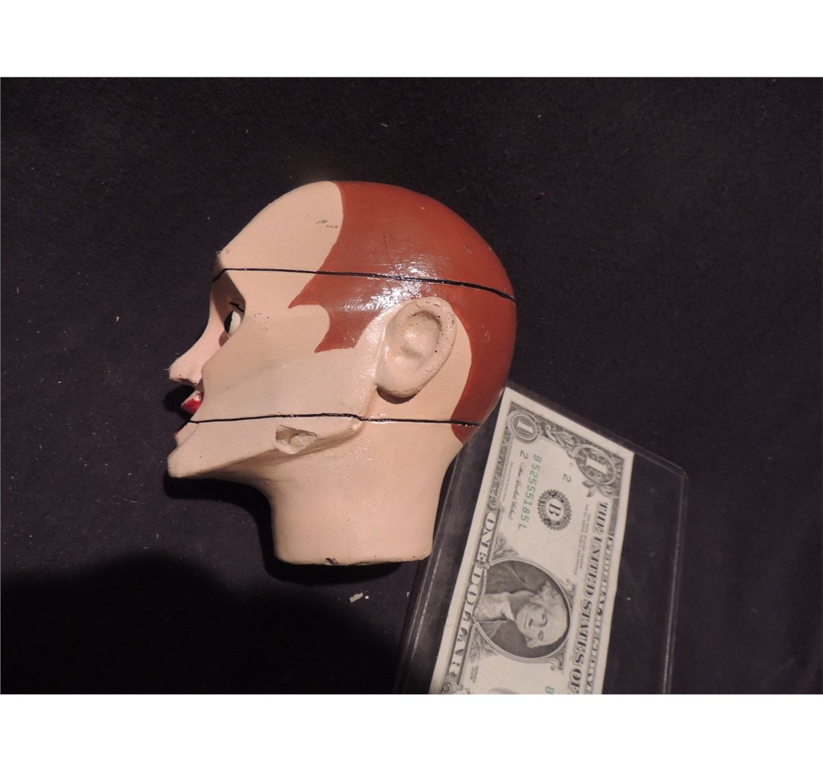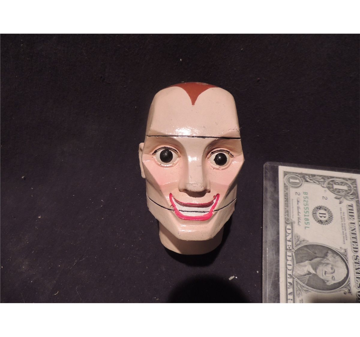 This is a production made Hero head of JESTER Smiling from PUPPET MASTER VS DEMONIC TOYS. This has a flaw in the cheek area, and a few bubbles in the ear. It was kept as a back up, but never used in the film.