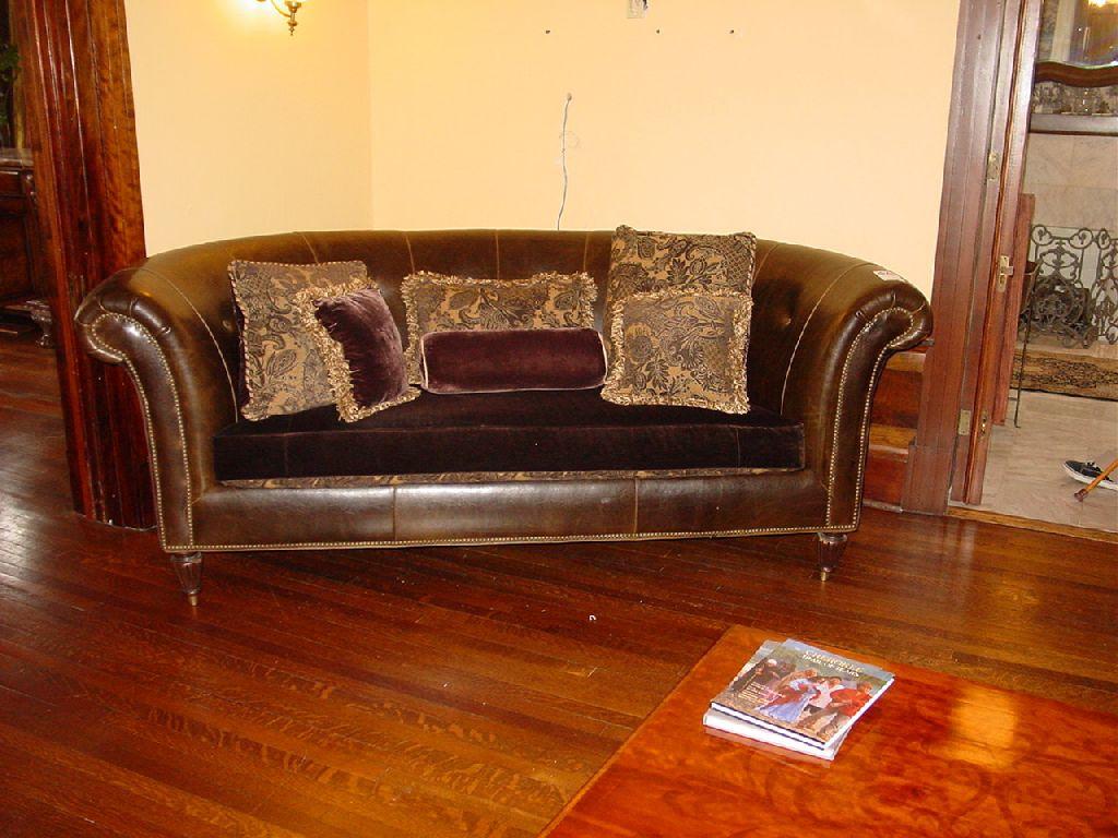 PURCHASED FROM BRUNO'S LEATHER AND VELVET CHOCOLATE BROWN OVER-SIZED COUCH W/ PILLOWS CUSTOM-SELECTED FABRICS