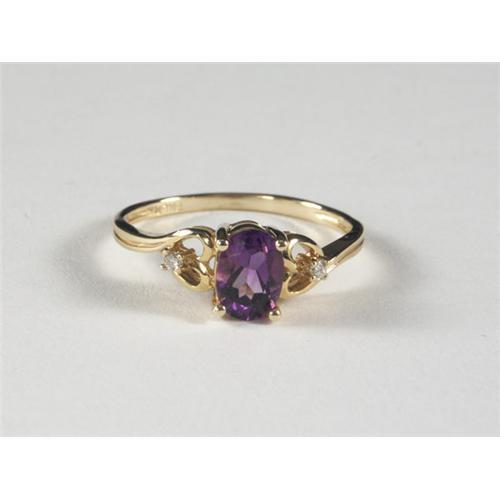 RING: Lovely 14K yellow gold and purple amethyst ring accented with two round cut diamonds. The oval cut amethyst measure approximately 0.60 cts and is tranparent. The diamonds measure approximately 0.03 ctw, have SI3 to I1 clarity and H color. Appraisal included.