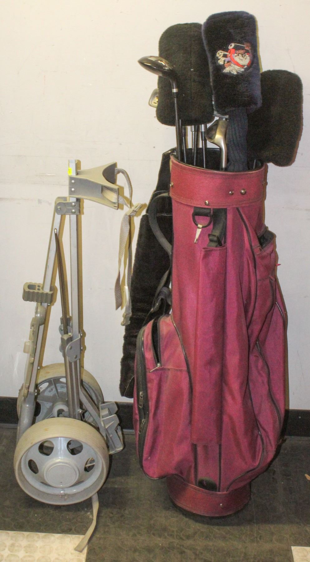PURPLE GOLF CLUB BAG WITH GOLF TROLLEY