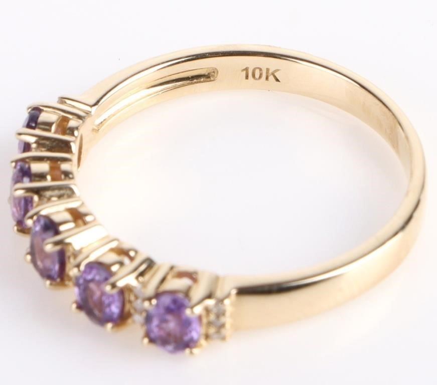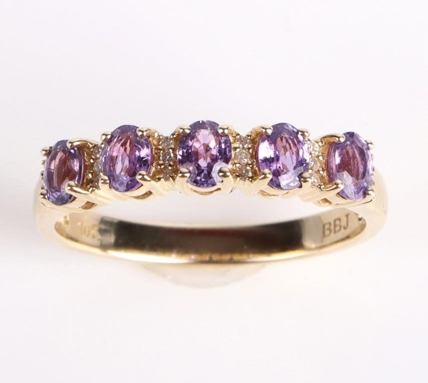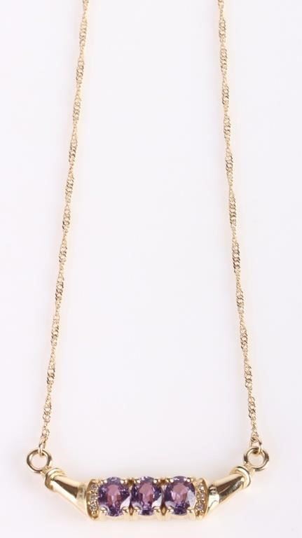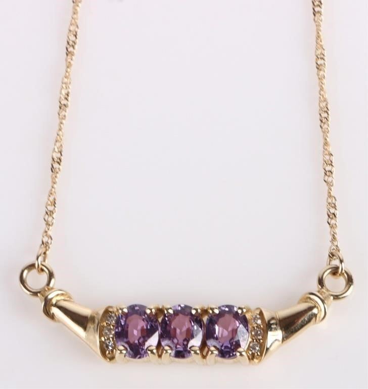 Purple sapphire diamond 10k yellow gold matching set to include five 0.10ct oval sapphires, eighteen 0.01ct round diamonds, one the necklace there is three 0.20ct oval sapphires and six 0.01ct round diamonds.