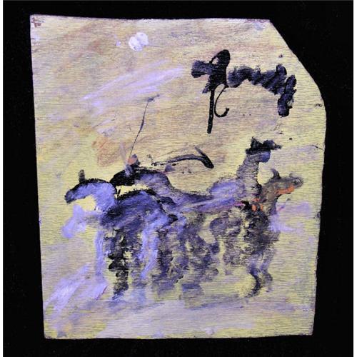 An original painting on wood of a group of horses under a sunlit yellow sky. This is a superb piece of Outsider Art, created by the artist Purvis Young. It depicts a group of horses, one apparently with a rider on it, and is untitled. Young's works are among the most coveted in the entire arena of Outsider Art, and his work is in all major collections of this artistic style. His larger pieces routinely sell above $2,000.00. This piece is oil paint on found wood, and was created in 1992. He is known for painting on wood that he finds in his neighborhood in Miami, Florida. Purvis Young likes to tell stories. He has a great appetite for knowledge of art history and classical artists. He has a love of horses, and often includes images of horses in his paintings. In this painting, the horses are roaming in all directions as the rider moves among them. His works are filled with color, unbridled compositions and wild energy. This is a lovely piece, with haunting colors on a yellow ground. It is signed by the artist at the upper right, 'Young' in black paint. Purvis Young is advancing in years now, and in frail health. His works are certainly destined to increase in value. The size is approximately 18.1 inches by 15.25 inches wide. This painting would make a superb addition to any collection of art, especially a collection of Outsider Art. <p>