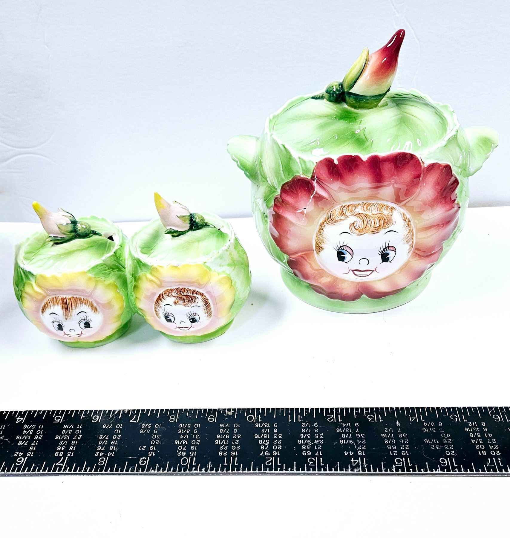 CONDIMENT JARS NO SPOONS HAS HAIRLINE CRACK BESIDE FACE COOKIE JAR HAS CRACK ON FRONT OF FACE AS SHOWN