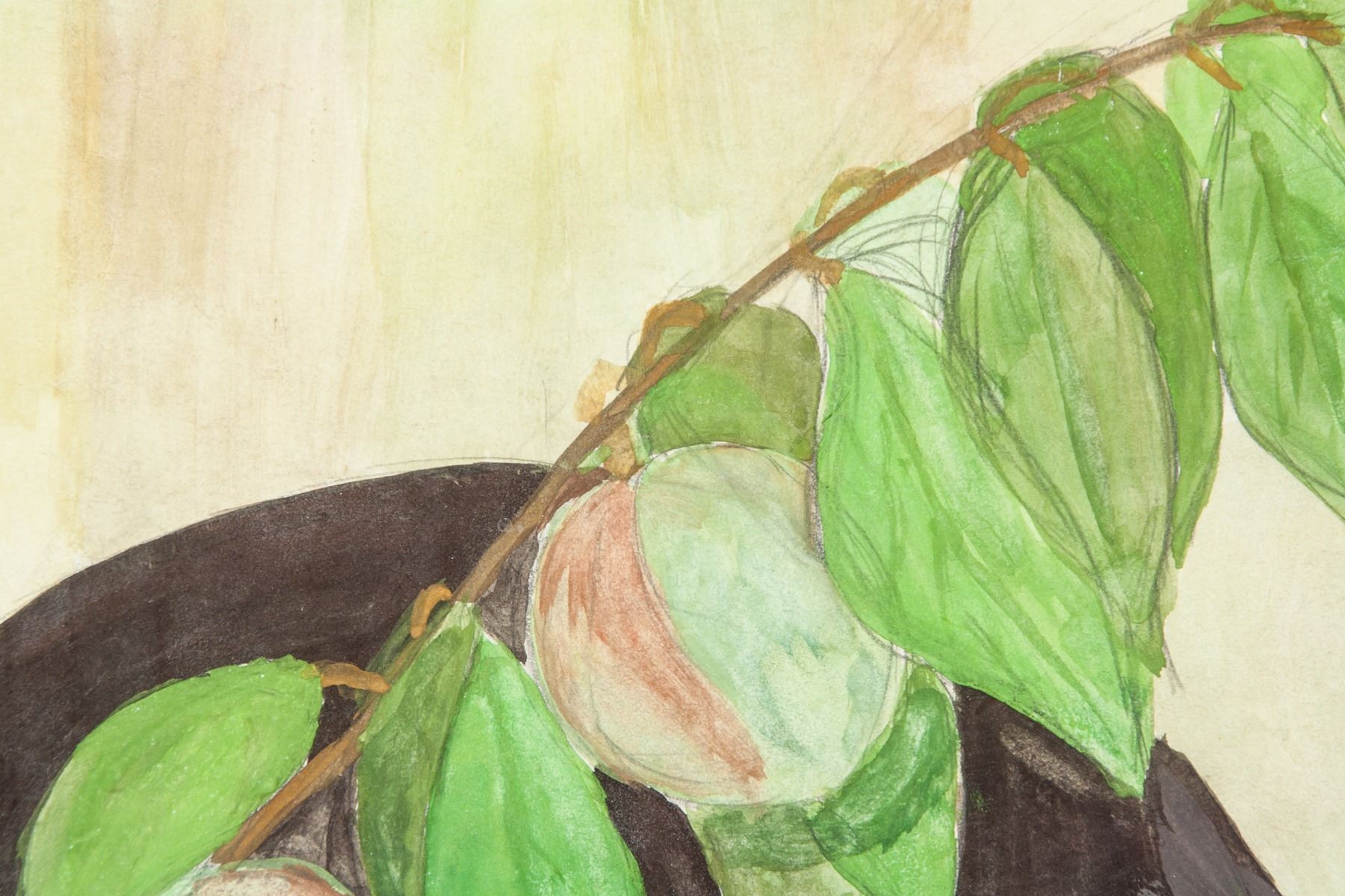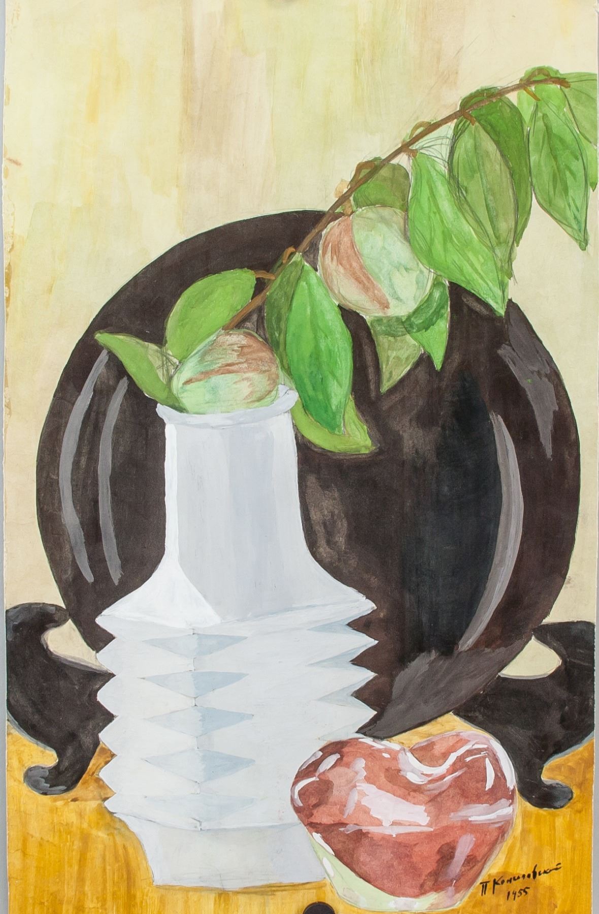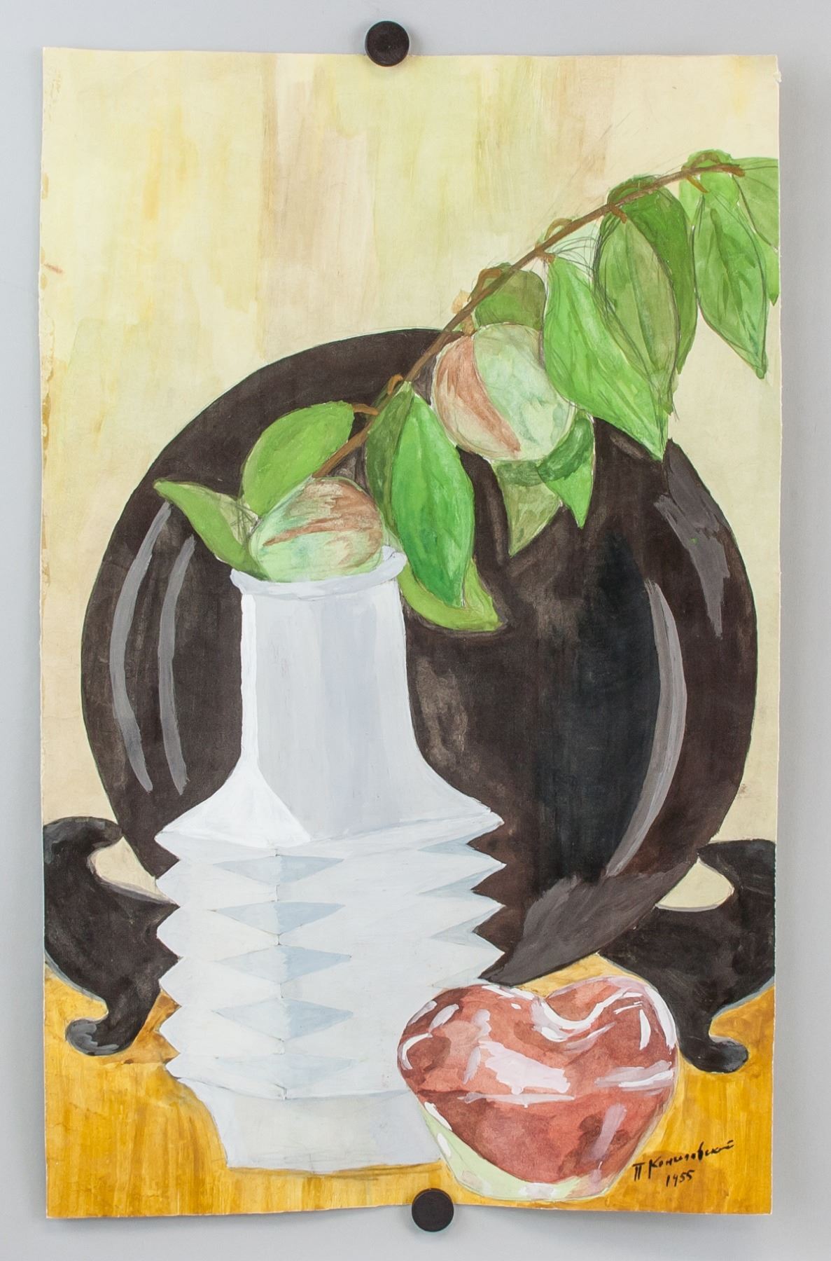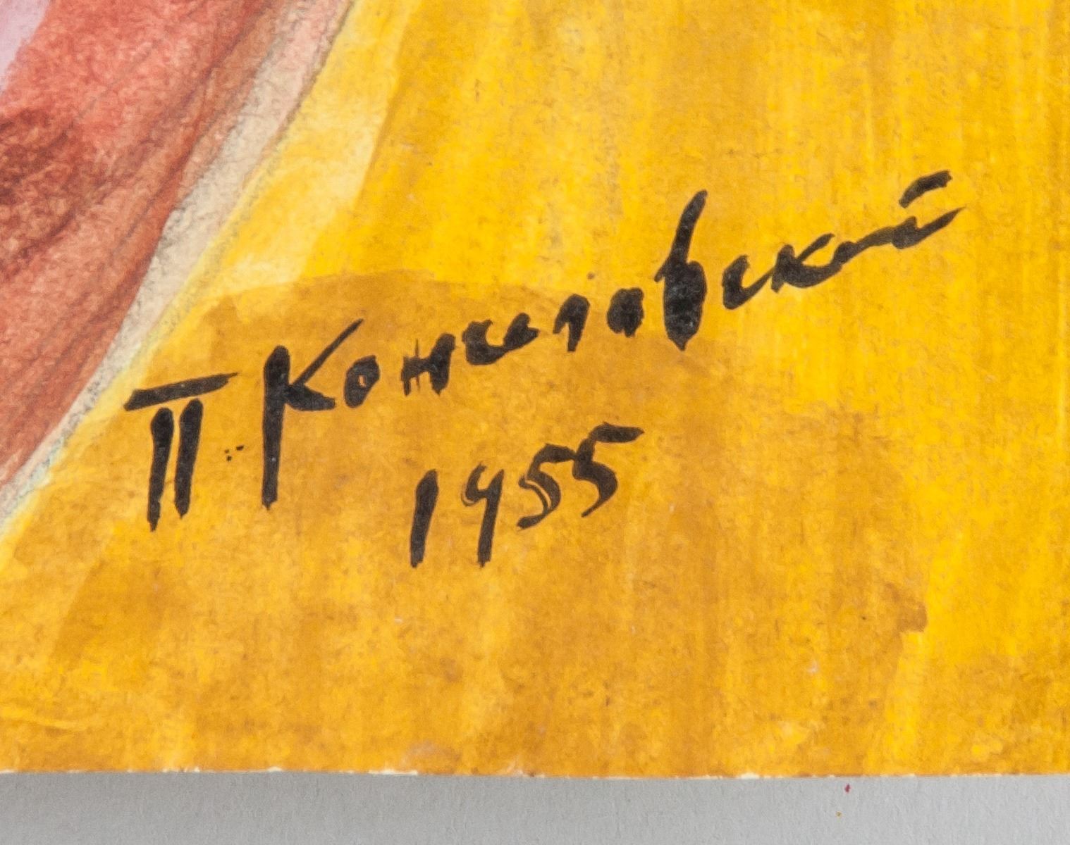 Watercolor. Featuring a still life of a vase, fruits and some foliage. Signed and attr. Pyotr Konchalovsky (Russian, 1876-1956) on the lower right corner and dated 1955. 51 x 32.5 cm (20 x 12.8 inches). Pyotr Konchalovsky was a Russian visual artist who was born in 1876. He has had several gallery and museum exhibitions, including at the Moscow Museum of Modern Art, Petrovka Street and at the Neue Galerie New York, Museum for German and Austrian Art. Many works by the artist have been sold at auction, including 'Portrait of Todzuro Kavarasaki, a Japanese actor' sold at Christie's London 'RUSSIAN ART' in 2008 for $2,061,242. There have been numerous articles about Pyotr Konchalovsky, including '‘Russian Modernism: Cross-Currents of German and Russian Art, 1907-1917’ Review' written by Lance Esplund for The Wall Street Journal in 2015. The artist died in 1956. PROVENANCE: Tane Art Gallery
