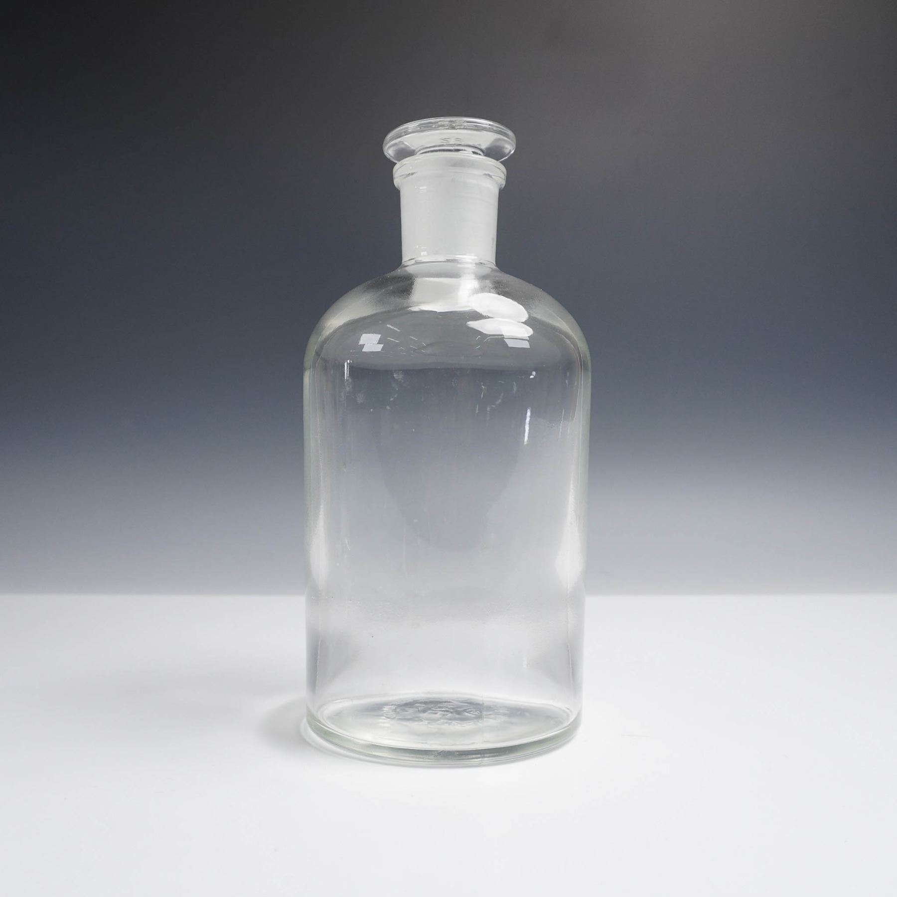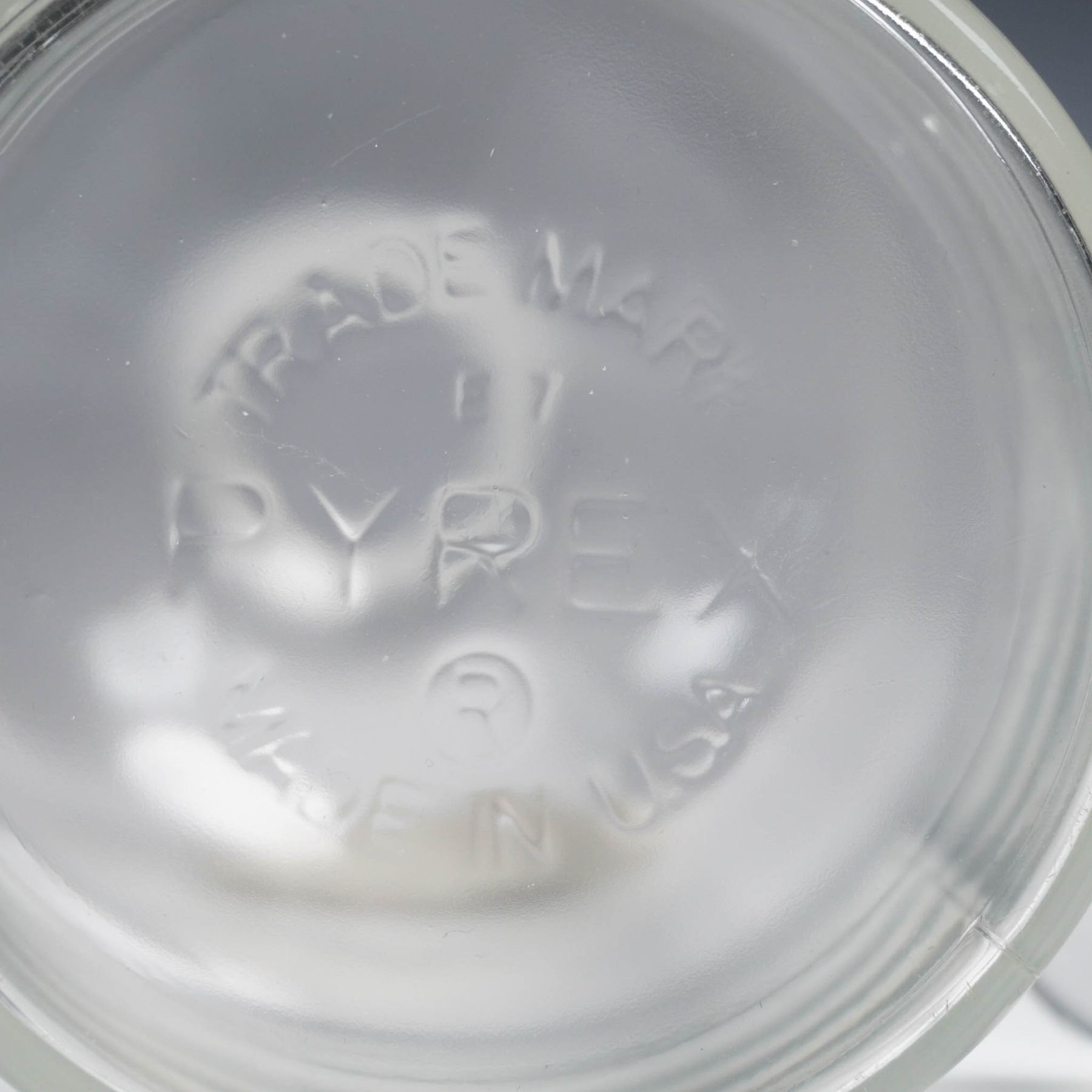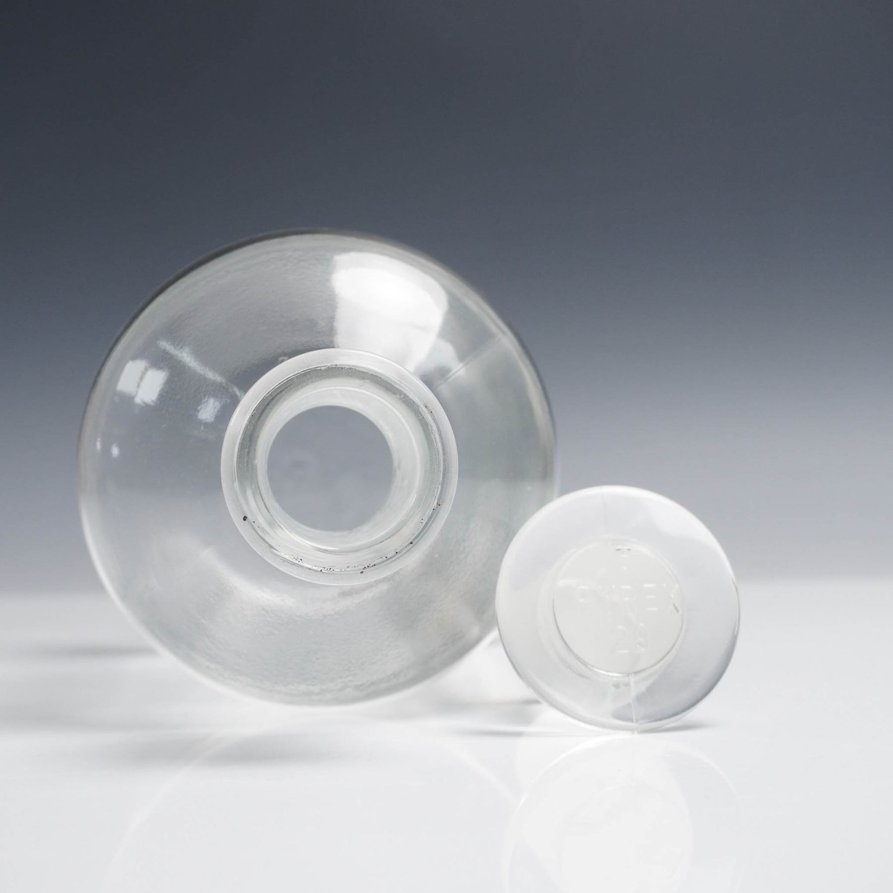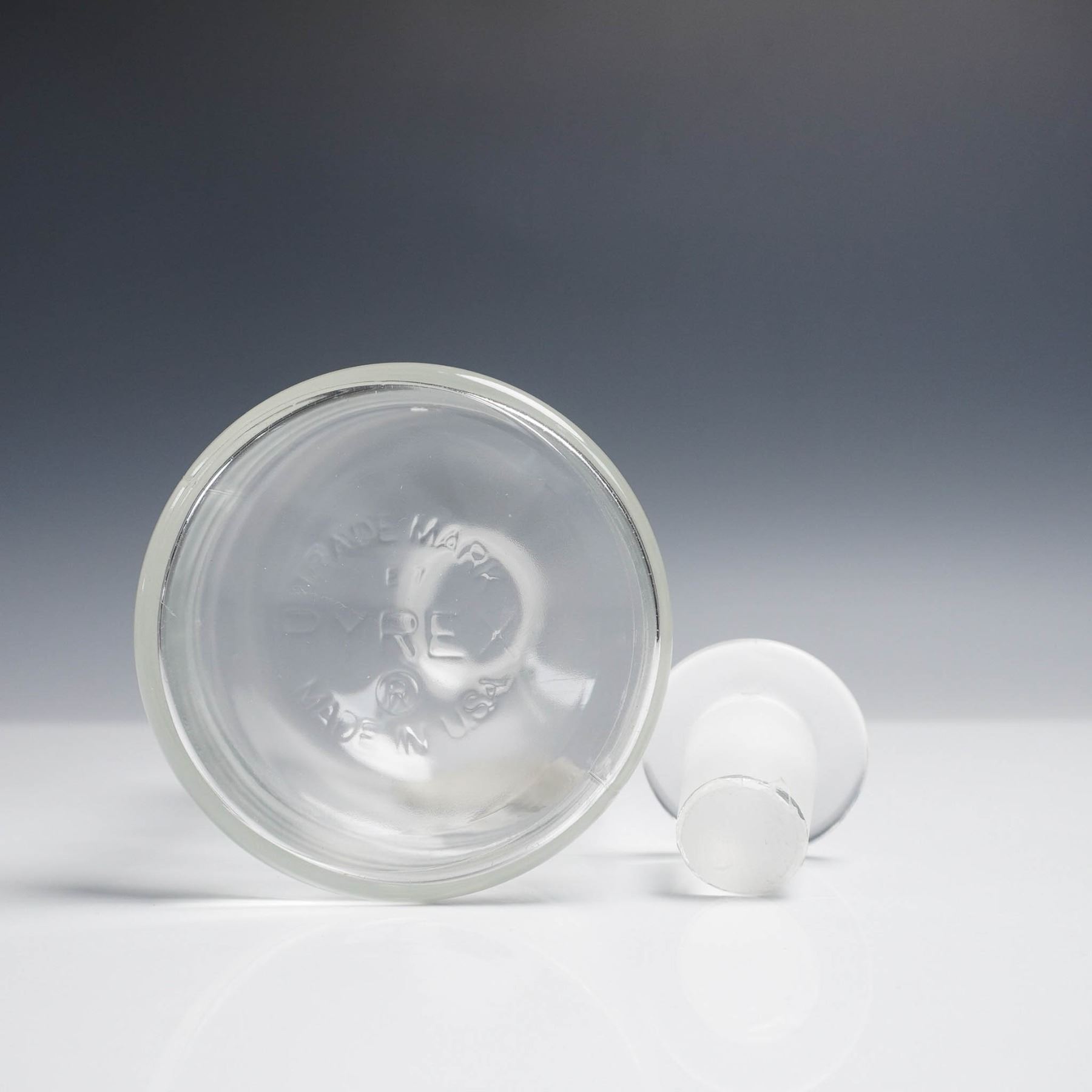 Vintage PYREX clear laboratory-style glass bottle featuring a fitted ground glass stopper marked PYREX 29. The base is embossed with the PYREX trademark, including the registered symbol and Made in USA notation. A functional and collectible piece ideal for display or scientific decor. Measures 9"H.