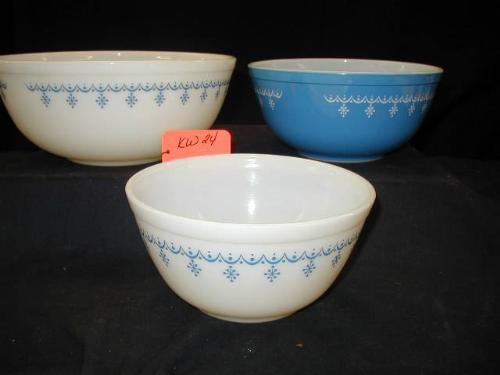 PYREX MIXING BOWLS 3 PC GRADUATED SET, 10 1/2in, 8 3/4in, 7 1/4in, BLUE & WHITE, EXCELLENT
