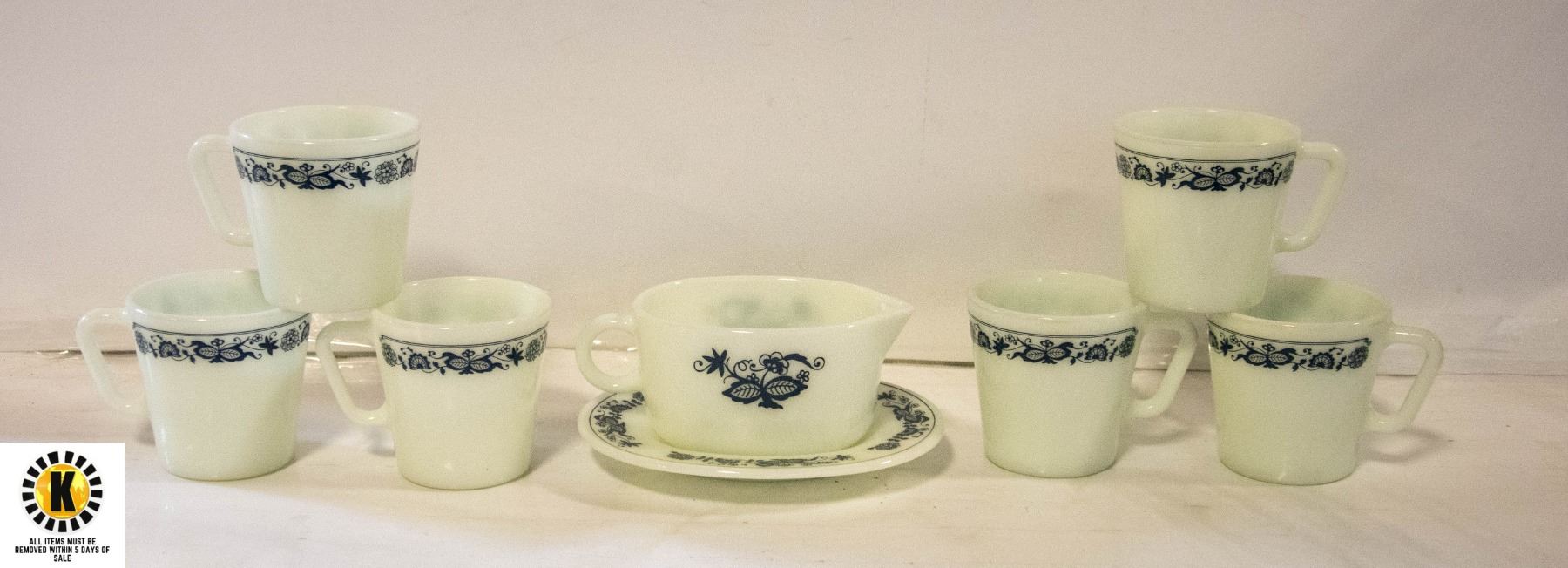 PYREX OLD TOWN BLUE GRAVY BOAT & 6 CUPS