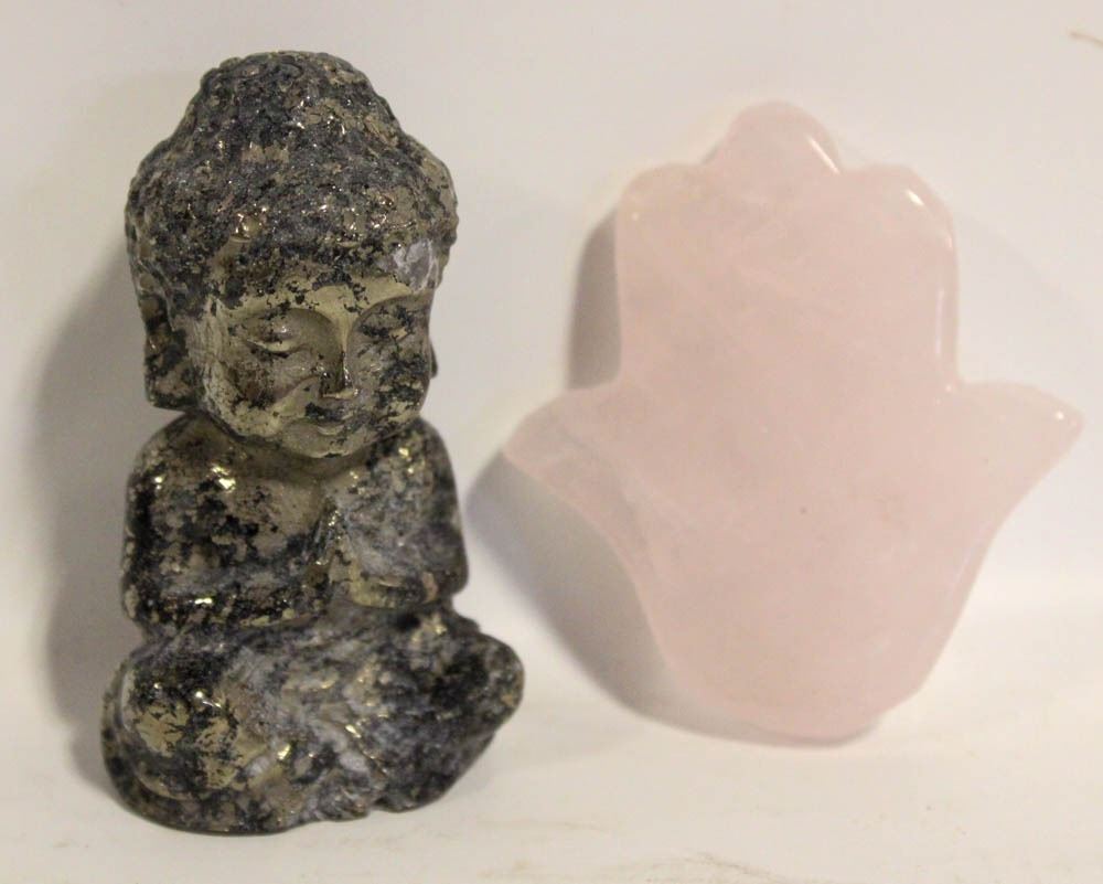 PYRITE BUDDHA 3INCH WITH ROSE QTZ HAMSA