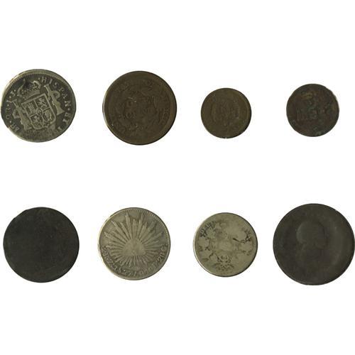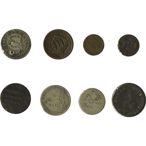 <B>Philadelphia Merchant Counterstamps on United States and Foreign Coins.</B></I> Included are C.M. Berry Saloon counterstamped on a dateless Carlos III 2 reales (holed, FINE), J.E. Caldwell and Co. Jewelers, Philadelphia, also counterstamped Durand 3 times, and Boston 3 times on an 1854 cent (VF); Collins & McLeester, Philadelphia on an 1881 cent (Fine); John W. Dewees, criss-cross embossed on 1903 cent, only part of name visible in each star (Fine); W. Heiss, 213 North, Philadelphia, 3 crude raised stars in incused rectangles on very worn copper, possibly a U.S. large cent (VG); J. Matter, Pottsville, counterstamped on a 1827 2 reales (VF); F. Webber and Co., Philadelphia, counterstamped on a very worn German 1870 1 mark (Fine, some damage to lettering); Oil City Flood and Fire, June 5, 1892 stamped with individual letter punches around border of George III halfpenny. 8 pieces