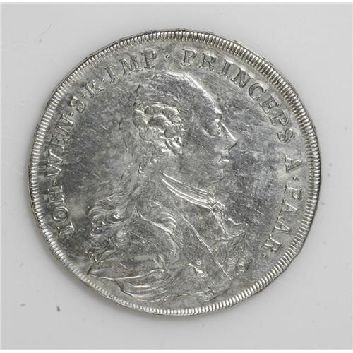 <B>Paar. Prince Johann Wenzel Taler 1771, </B></I>KM2, Davenport 1193, XF, harshly cleaned obverse with small marks in the fields, attractive reverse with bold features and abundant flashy mint luster. Rare type.<BR><I>From the Blue Ridge Collection</B></I><BR><BR><b>Shipping:</b> Coin/Currency (<a target="_blank" href="http://www.heritageauctions.com/common/shipping.php">view shipping information</a>)