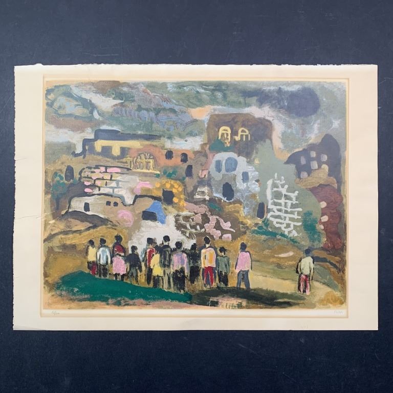 Pabbi's "Watching the City" limited edition print, signed lower right and numbered 53/200 lower left. This piece is of a group of villagers overlooking a city. This piece is in good condition with two major incisions at left, and a minor incision at left, small crease lower left corner.