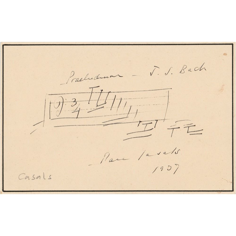 AMQS on an off-white 5.5 x 3.5 card, signed and dated below by Pablo Casals. The great cellist pens a line from "Praeludium - J. S. Bach." In fine condition.