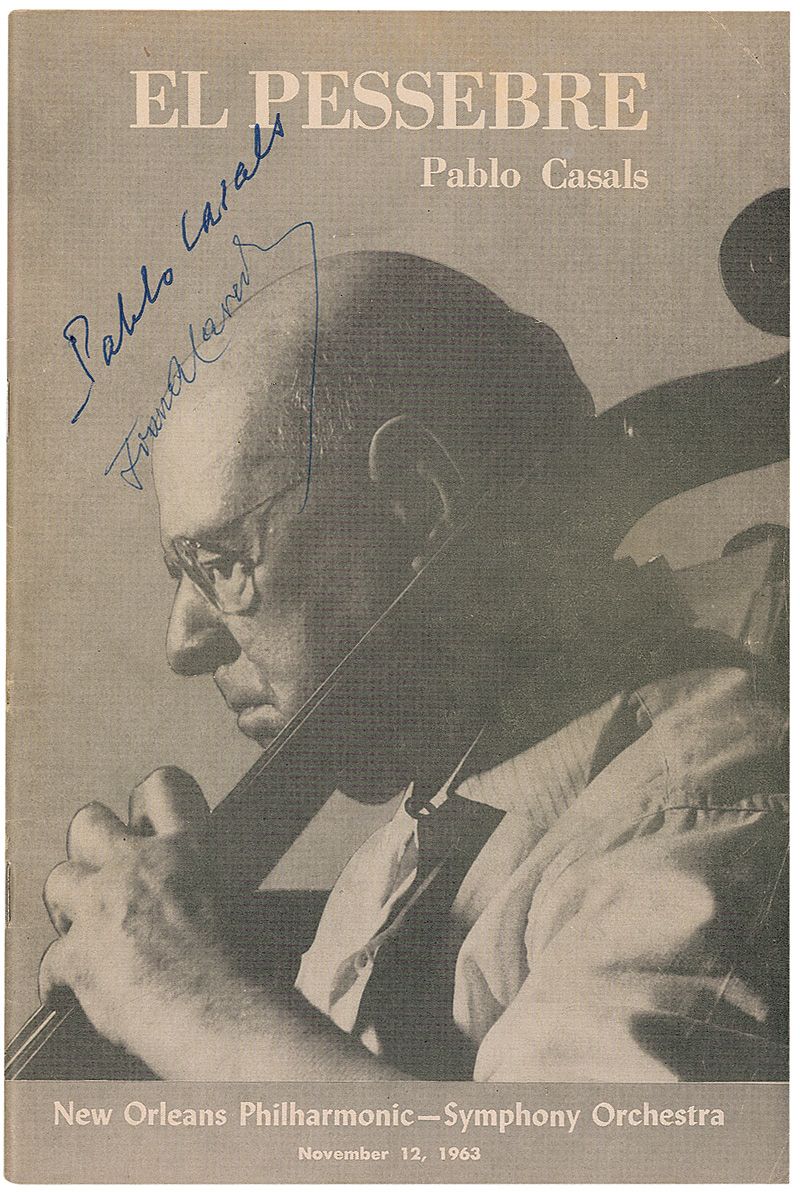 Program for El Pessebre by Pablo Casals performed with the New Orleans Philharmonic Symphony Orchestra, 6 x 9, 48 pages, November 12, 1963, signed on the front cover in blue ballpoint by Casals and one other. In fine condition, with some mild scattered creases and a crease to the upper right corner tip.