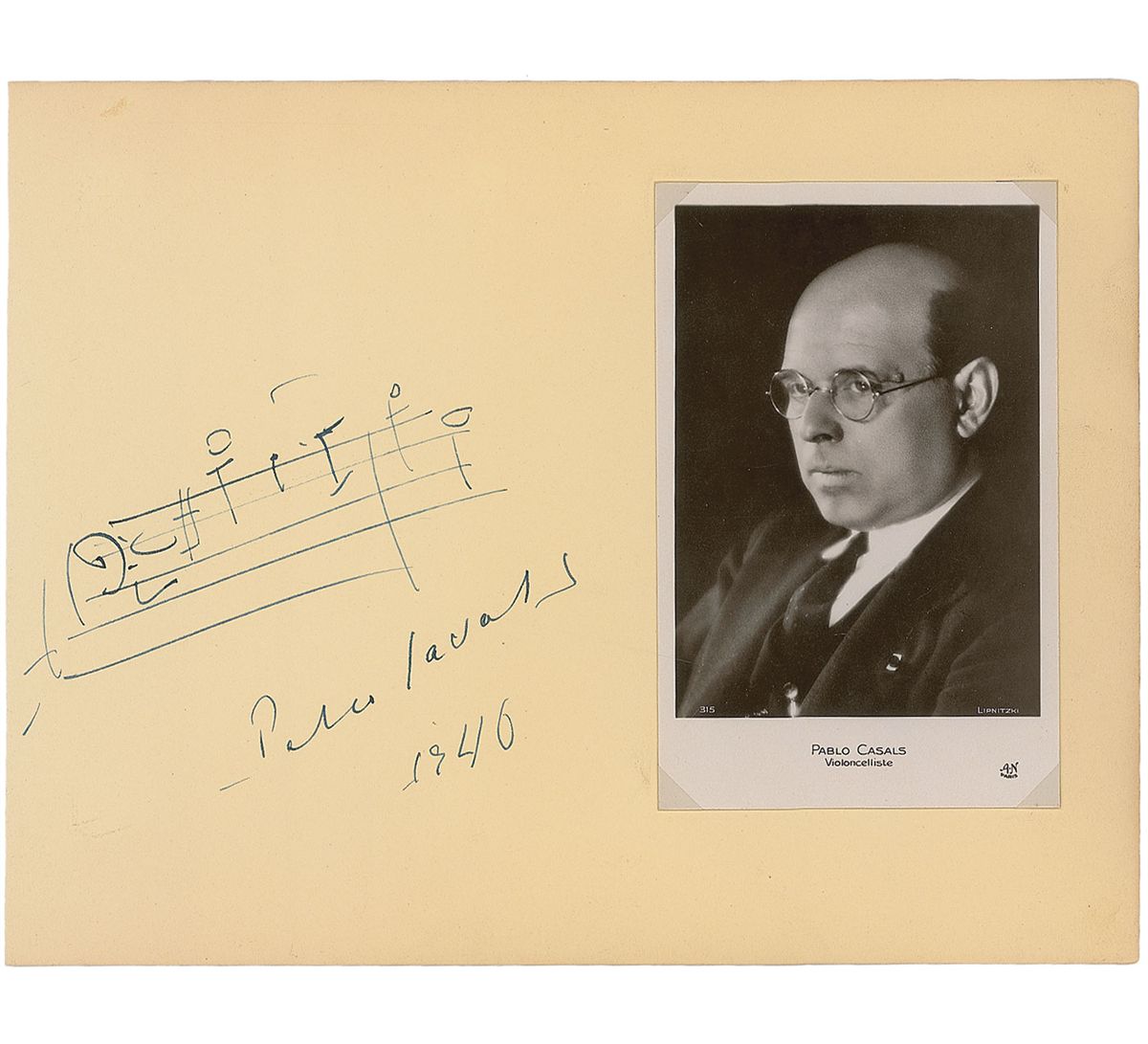 AMQS on an off-white 10 x 7.75 cardstock sheet, signed in fountain pen, “Pablo Casals, 1940.” Casals pens two bars of music. An unsigned postcard portrait is corner-mounted to the right side. In fine condition.