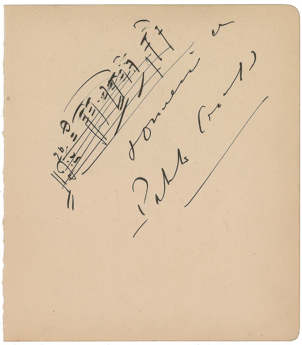 Boldly penned AMQS on an off-white 6 x 7 album page, signed in fountain pen. Casals pens two bars of music, adding the title below. In fine condition.