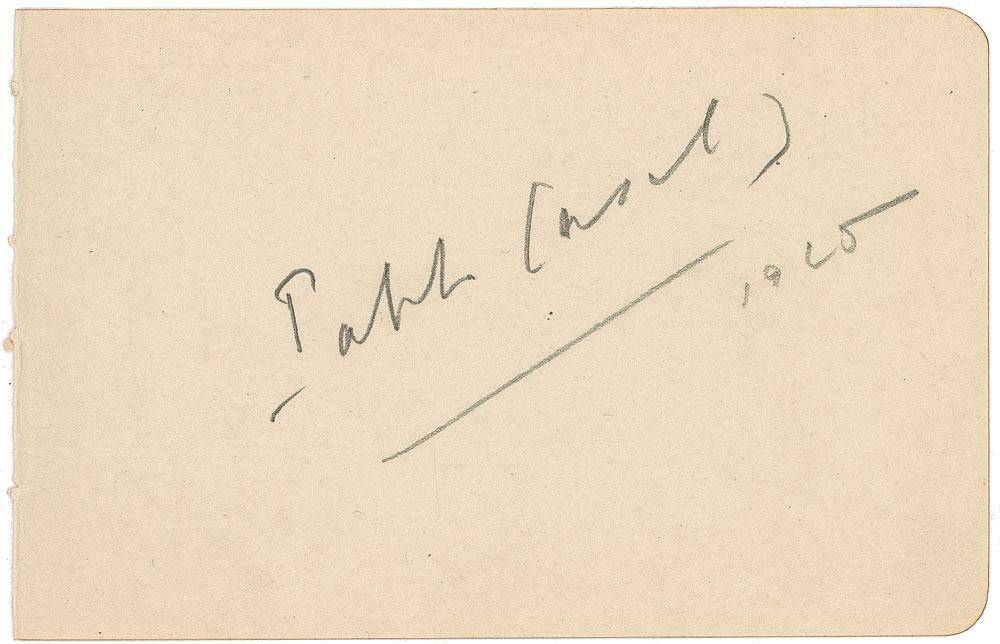 Revered Spanish cellist and composer (1876–1973) widely regarded as the greatest player in the history of the instrument. Vintage pencil signature, “Pablo Casals 1925,” on an off-white 5.75 x 3.75 album page. In fine condition, with slightly rough left edge from removal. RRAuction COA.
