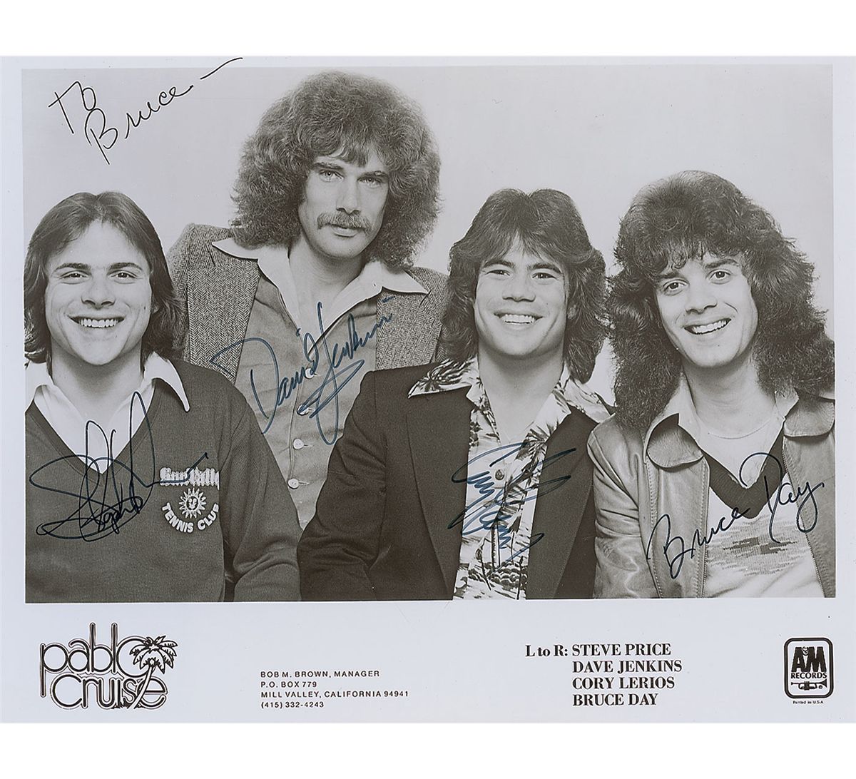 Glossy 10 x 8 A&M Records publicity photo, signed in felt tip by Bruce Day, Steve Price, Dave Jenkins, and Cory Lerios, with an inscription added in another hand in the upper left corner. In very good condition, with scattered surface bends and creases, some horizontal streaking to the finish, and a trimmed top edge.