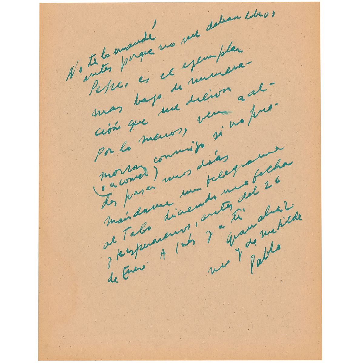 Esteemed Chilean writer and politician (1904–1973) who won the 1971 Nobel Prize in Literature, best known for his intense poems of love. ALS in Spanish, signed “Pablo,” one page, 7.5 x 9.75, no date. In part (translated): “I did not send you before because they have not given me books…If you can’t pass more days send me a telegram…telling me the date and we will wait.” In fine condition, with uniform toning. Accompanied by an unsigned photo of Neruda. As in this letter, he often wrote in green ink, which was his personal symbol for desire and hope.
