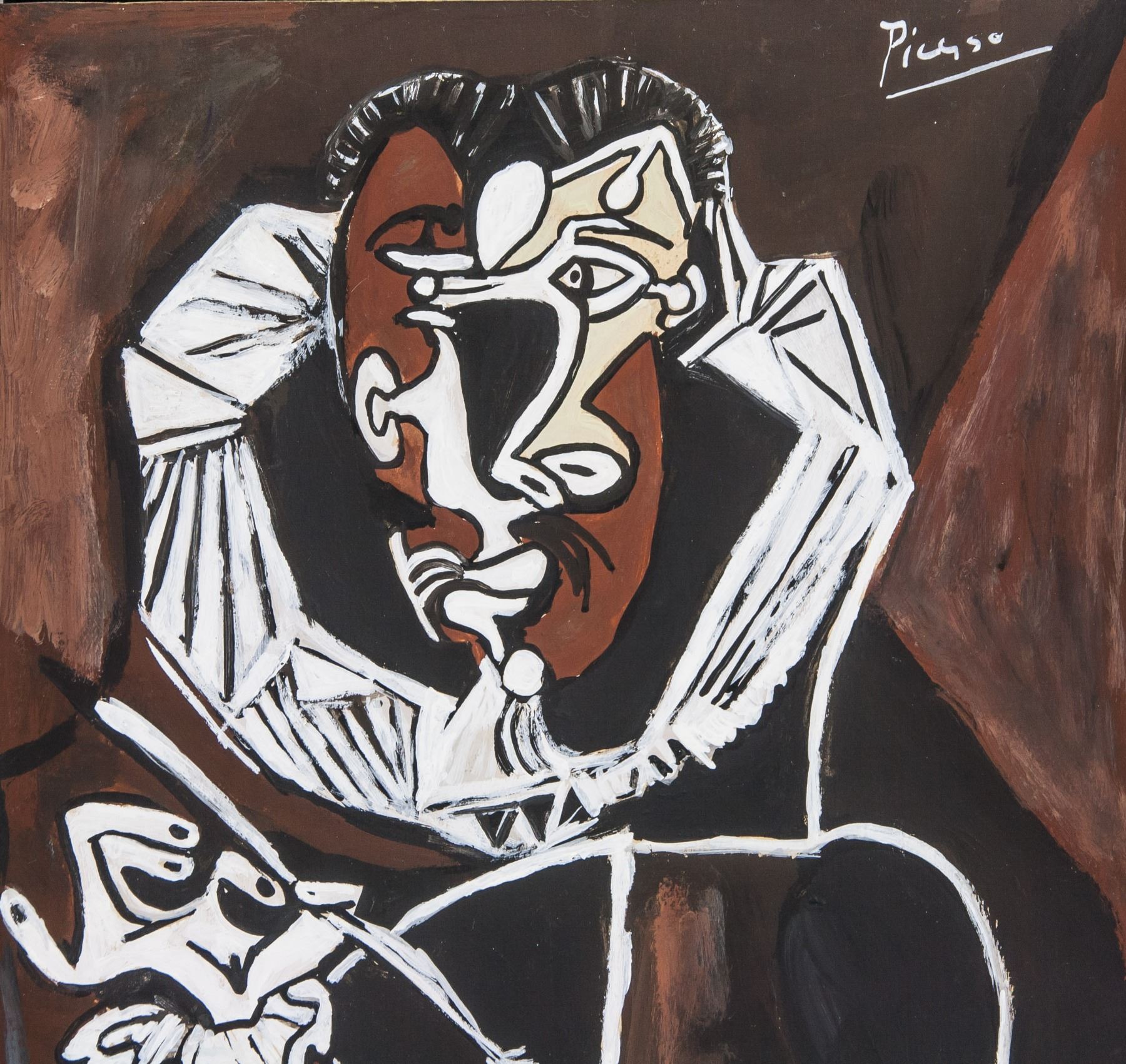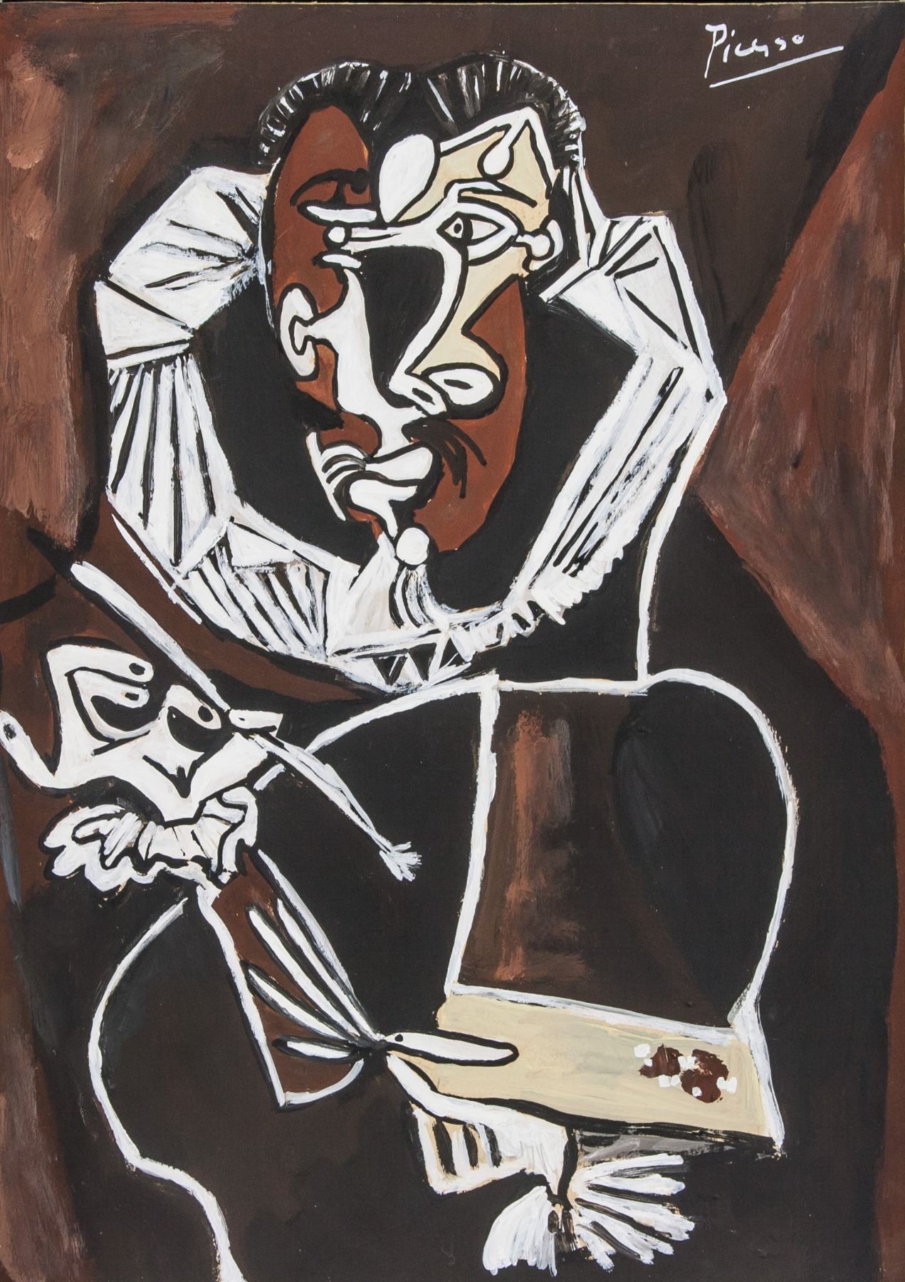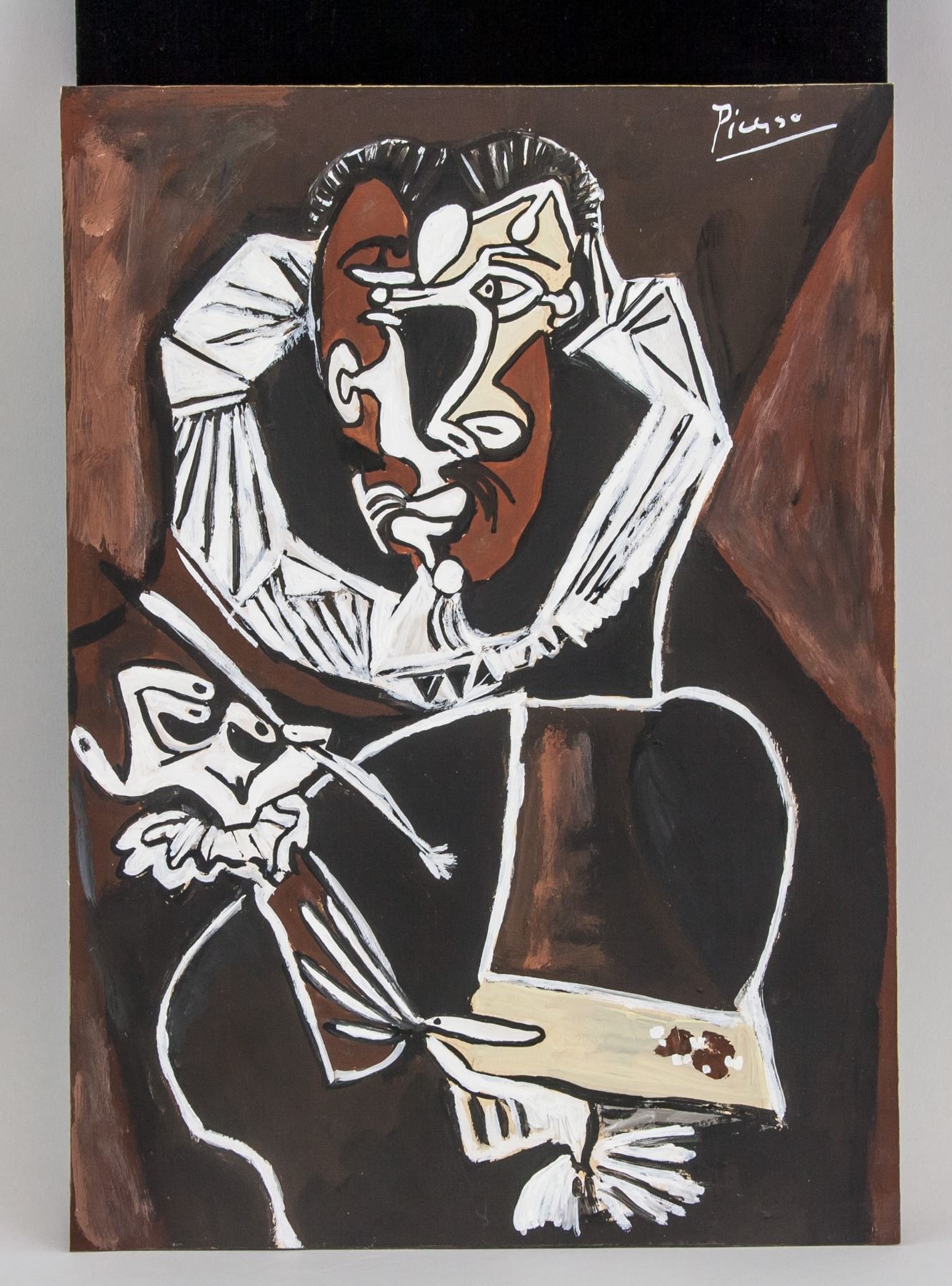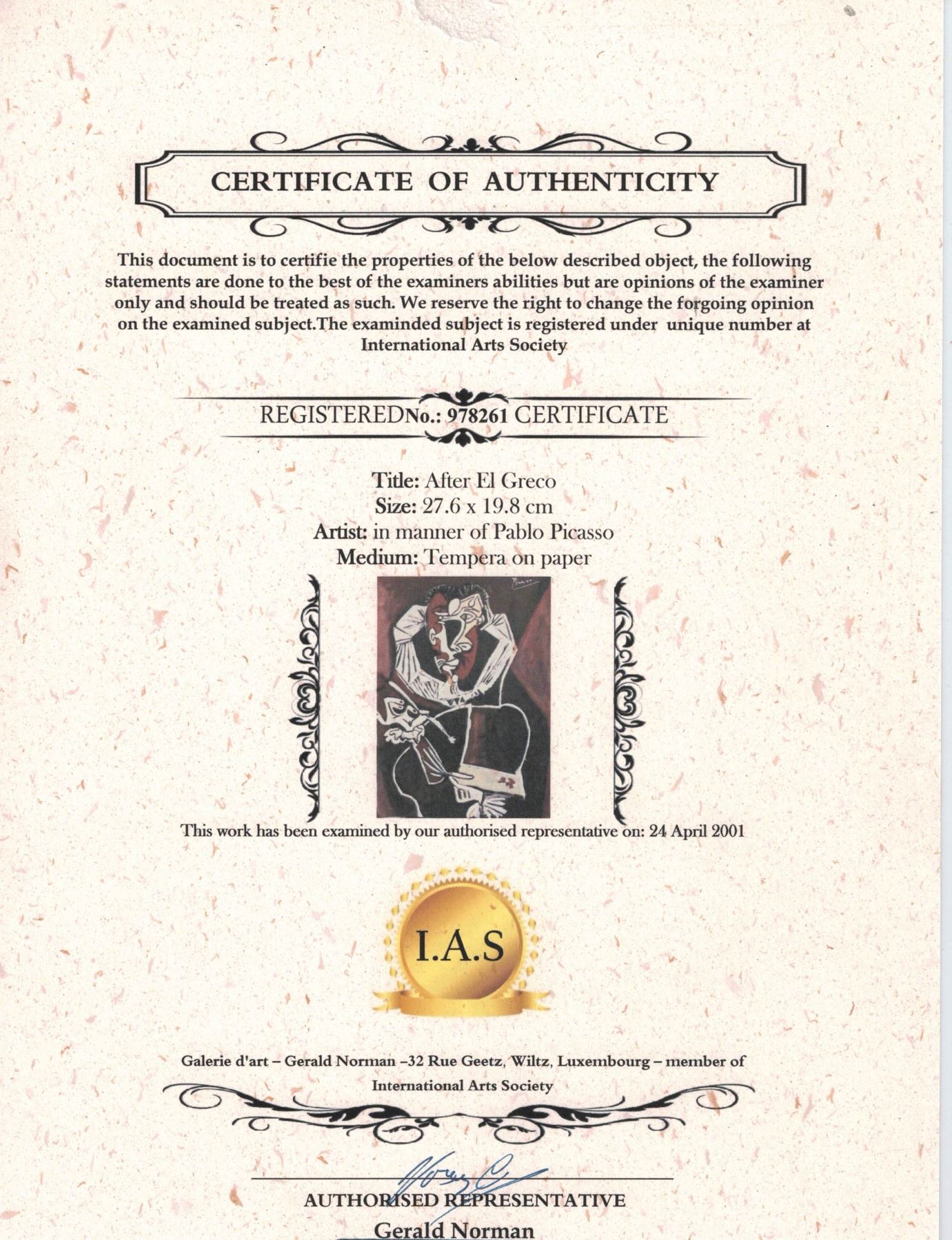 Tempera on paper cubist portrait, entitled, "El Greco." Signed and attr. Pablo Picasso (Spain, 1881-1973) on bottom right corner. 10.86 x 7.80 inch (27.6 x 19.8 cm). Accompanied with certificate of attribution from International Art Society, Galeri d'art, Luxumbourg. A prolific and tireless innovator of art forms, Pablo Picasso impacted the course of 20th-century art with unparalleled magnitude. Inspired by African and Iberian art and developments in the world around him, Picasso contributed significantly to a number of artistic movements, notably Cubism, Surrealism, Neoclassicism, and Expressionism. Along with Georges Braque, Picasso is best known for pioneering Cubism in an attempt to reconcile three-dimensional space with the two-dimensional picture plane, once asking, “Are we to paint what’s on the face, what’s inside the face, or what’s behind it?” Responding to the Spanish Civil War, he painted his most famous work, Guernica (1937), whose violent images of anguished figures rendered in grisaille made it a definitive work of anti-war art. “Painting is not made to decorate apartments,” he said. “It’s an offensive and defensive weapon against the enemy.” Picasso’s sizable oeuvre includes over 20,000 paintings, prints, drawings, sculptures, ceramics, theater sets, and costume designs. PROVENANCE: Private collection (Chicago, IL)