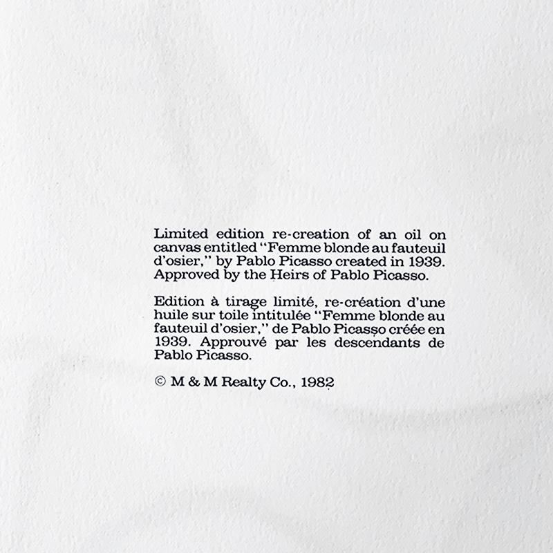 "Femme Blonde Au Fauteuil D'Osier" is a limited edition lithograph on paper by Pablo Picasso (1881-1973). This piece comes from a collection known as the Picasso Estate Collection - a selection of pieces inherited by the iconic artist's granddaughter, Marina Picasso. This piece is limited to a 500 and is hand signed by Marina Picasso. Includes Letter of Authenticity. Measures approx. 21.5" x 28.5" (border); 17.5" x 22" (image).