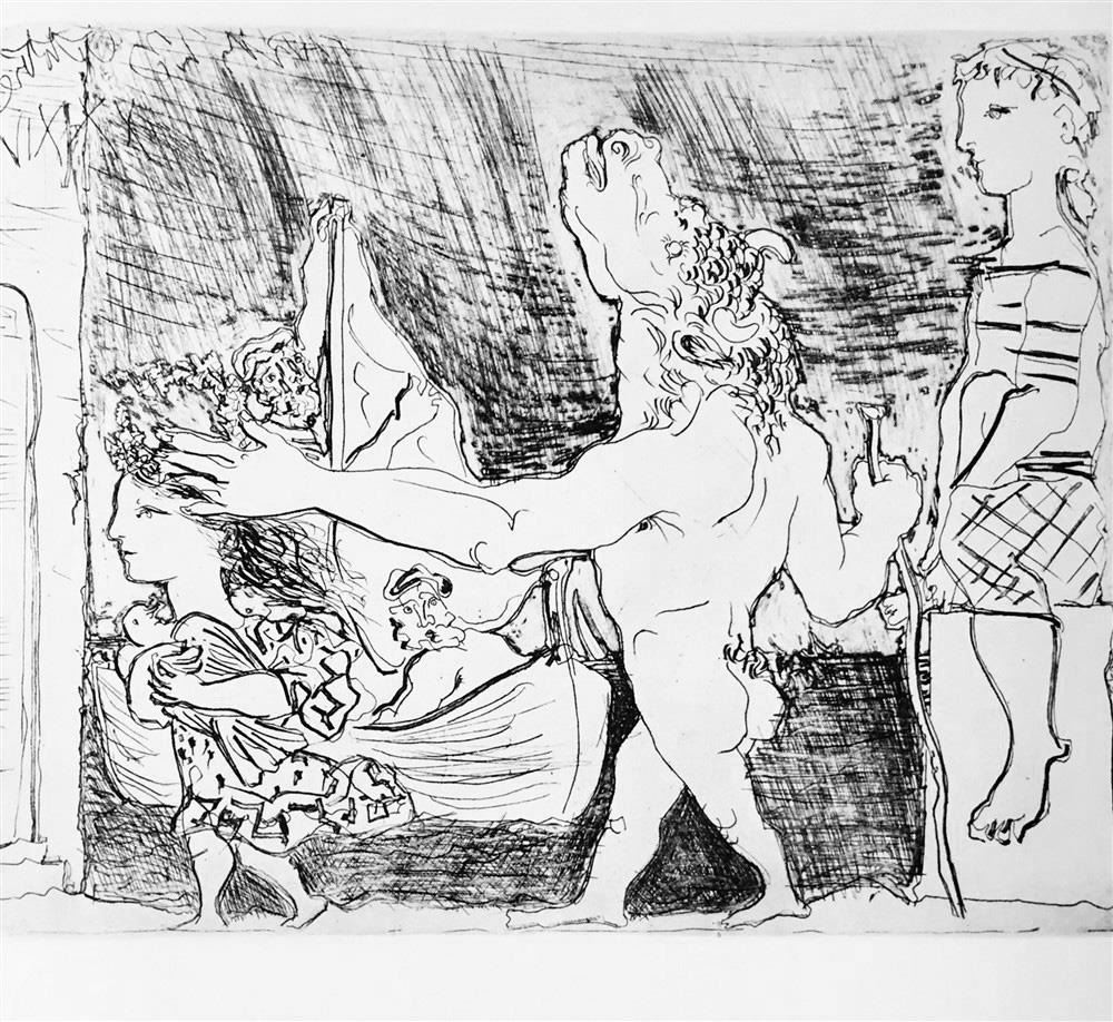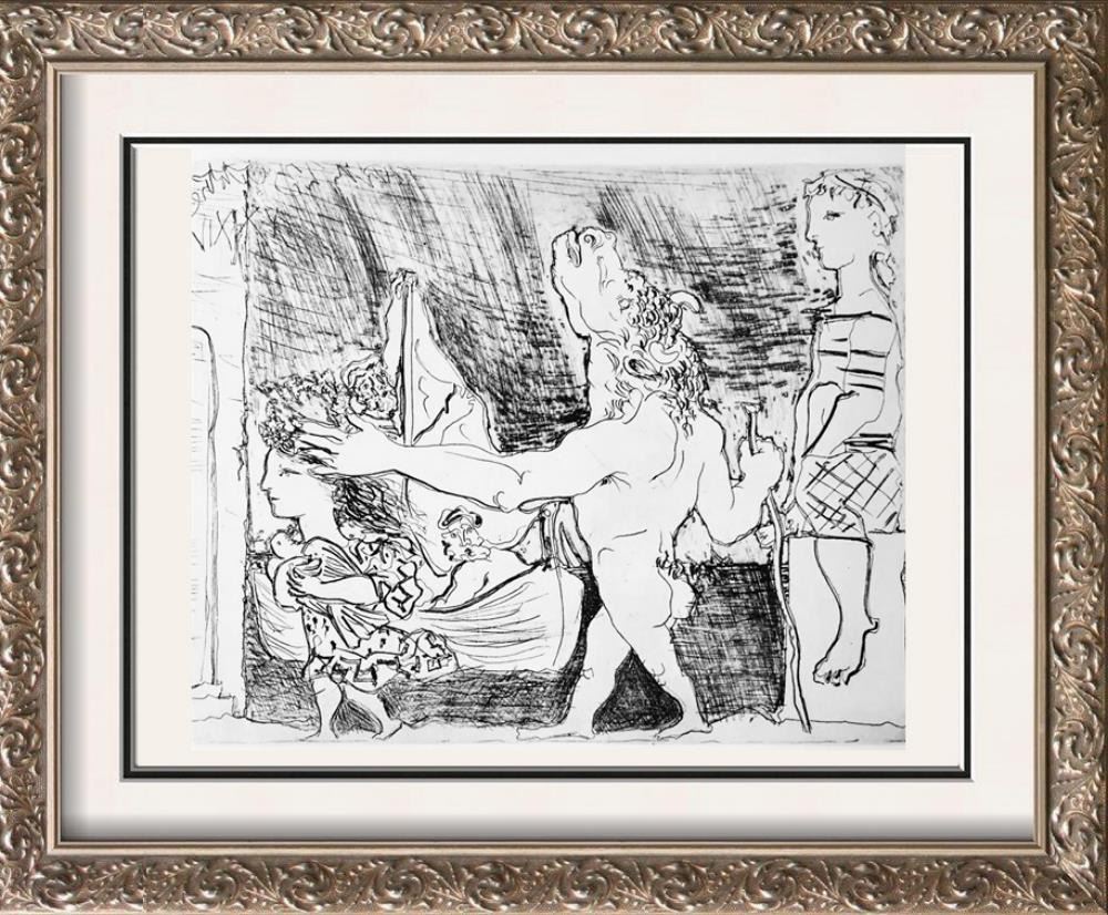 Artist Name: Pablo Picasso | Title of Art: (Plate Eighty Seven ) Blind Minotaur c. 1934 | Medium: High Quality Double-Sided Fine Art Book Plate | Unsigned | Image Size: Approx 7 x 9 | Paper Size 11 x 8 | Offered Unframed: Framing presentation if shown is for concept only | If you need assistance with custom framing, call the experts at ArtForSale | Circa 1955 | Published in Germany by Verlag Gerd Hatje, Stuttgart. Printed in Germany and Switzerland