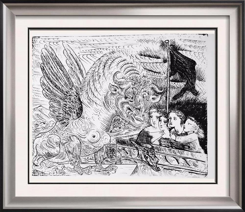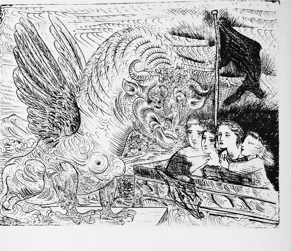 Artist Name: Pablo Picasso | Title of Art: (Plate Eighty Four ) Bull Headed Sphinx c. 1933 | Medium: High Quality Double-Sided Fine Art Book Plate | Unsigned | Image Size: Approx 7 x 8 | Paper Size 11 x 8 | Offered Unframed: Framing presentation if shown is for concept only | If you need assistance with custom framing, call the experts at ArtForSale | Circa 1955 | Published in Germany by Verlag Gerd Hatje, Stuttgart. Printed in Germany and Switzerland
