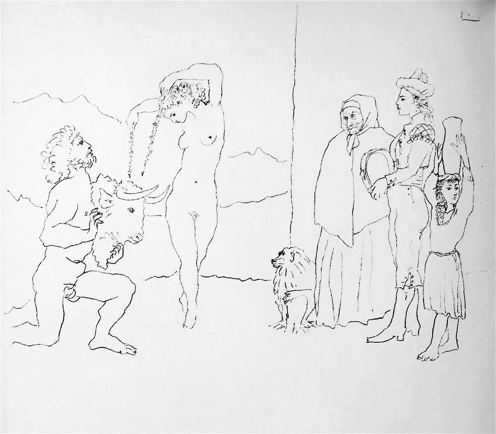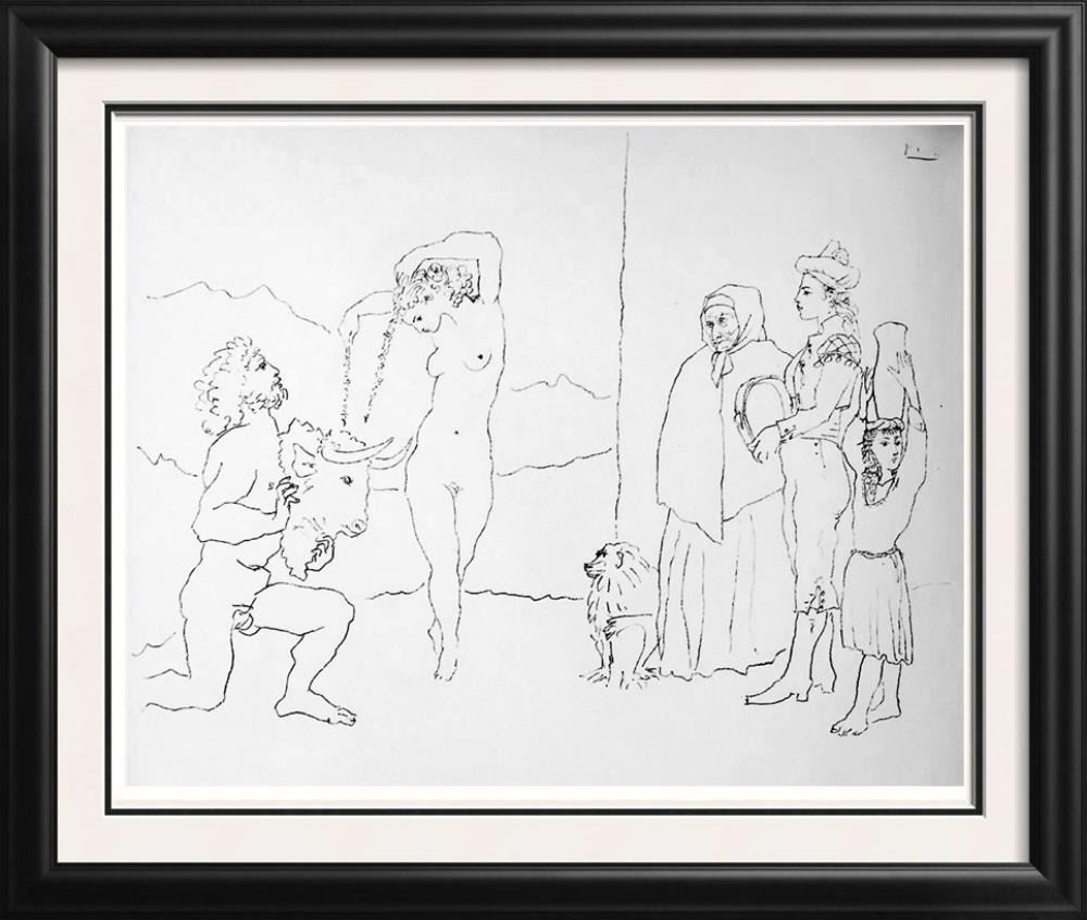 Artist Name: Pablo Picasso | Title of Art: (Plate One Hundred Sixty Four) Dance of the Banderillas c. 1954 | Medium: High Quality Double-Sided Fine Art Book Plate | Unsigned | Image Size: Approx 7 x 8 | Paper Size 11 x 8 | Offered Unframed: Framing presentation if shown is for concept only | If you need assistance with custom framing, call the experts at ArtForSale | Circa 1955 | Published in Germany by Verlag Gerd Hatje, Stuttgart. Printed in Germany and Switzerland