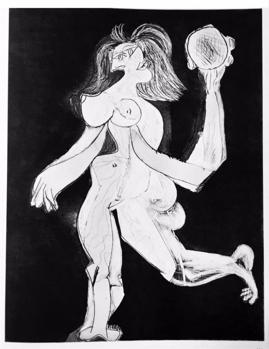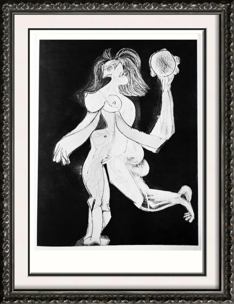 Artist Name: Pablo Picasso | Title of Art: (Plate One Hundred Three ) Dance with Tambourine c. 1938 | Medium: High Quality Double-Sided Fine Art Book Plate | Unsigned | Image Size: Approx 10 x 9 | Paper Size 11 x 8 | Offered Unframed: Framing presentation if shown is for concept only | If you need assistance with custom framing, call the experts at ArtForSale | Circa 1955 | Published in Germany by Verlag Gerd Hatje, Stuttgart. Printed in Germany and Switzerland