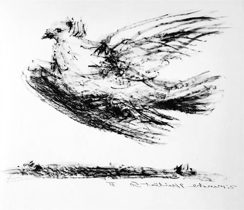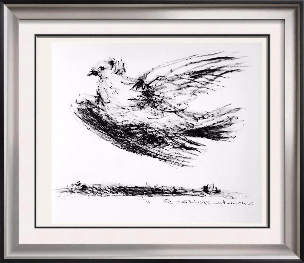 Artist Name: Pablo Picasso | Title of Art: (Plate One Hundred Fifty Three) Dove in Flight c. 1950 | Medium: High Quality Double-Sided Fine Art Book Plate | Unsigned | Image Size: Approx 7 x 8 | Paper Size 11 x 8 | Offered Unframed: Framing presentation if shown is for concept only | If you need assistance with custom framing, call the experts at ArtForSale | Circa 1955 | Published in Germany by Verlag Gerd Hatje, Stuttgart. Printed in Germany and Switzerland