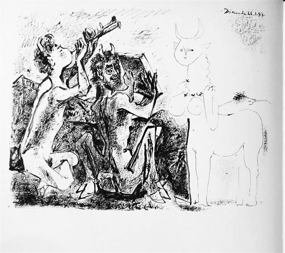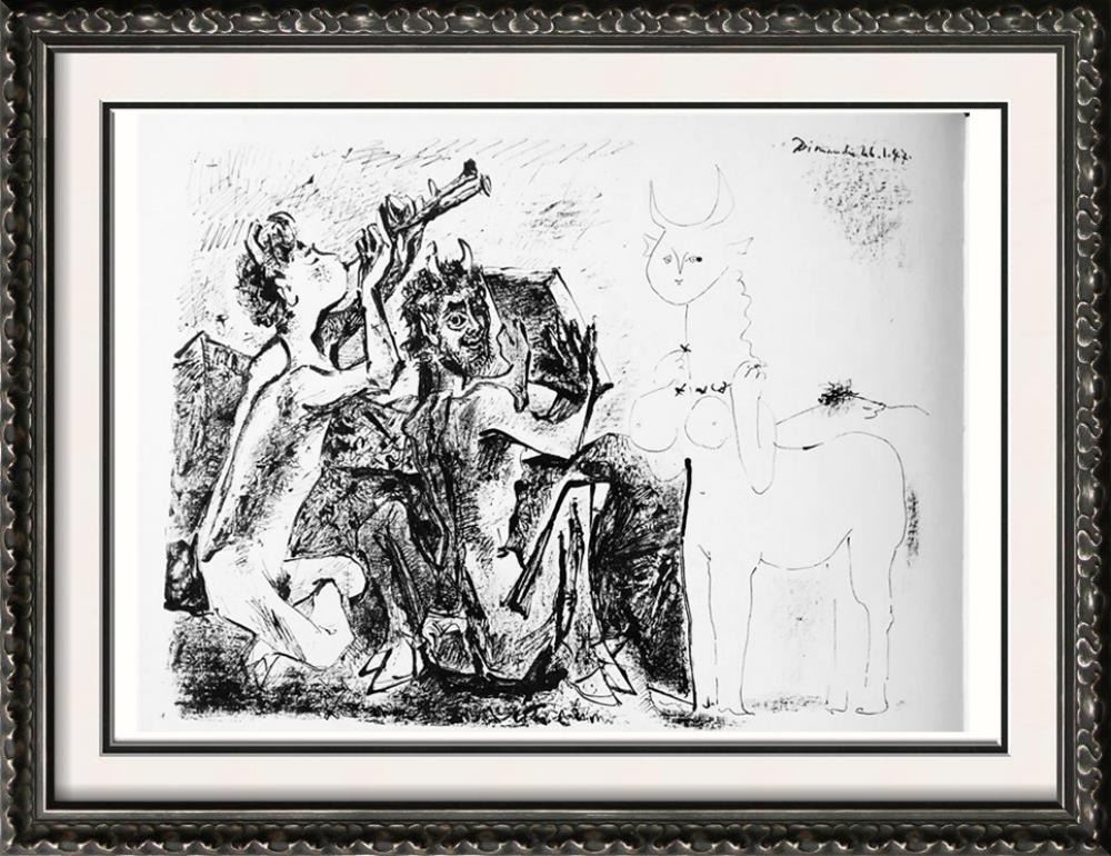 Artist Name: Pablo Picasso | Title of Art: (Plate One Hundred Twenty Six) Fauns and Centauress c. 1947 | Medium: High Quality Double-Sided Fine Art Book Plate | Unsigned | Image Size: Approx 7 x 8 | Paper Size 11 x 8 | Offered Unframed: Framing presentation if shown is for concept only | If you need assistance with custom framing, call the experts at ArtForSale | Circa 1955 | Published in Germany by Verlag Gerd Hatje, Stuttgart. Printed in Germany and Switzerland