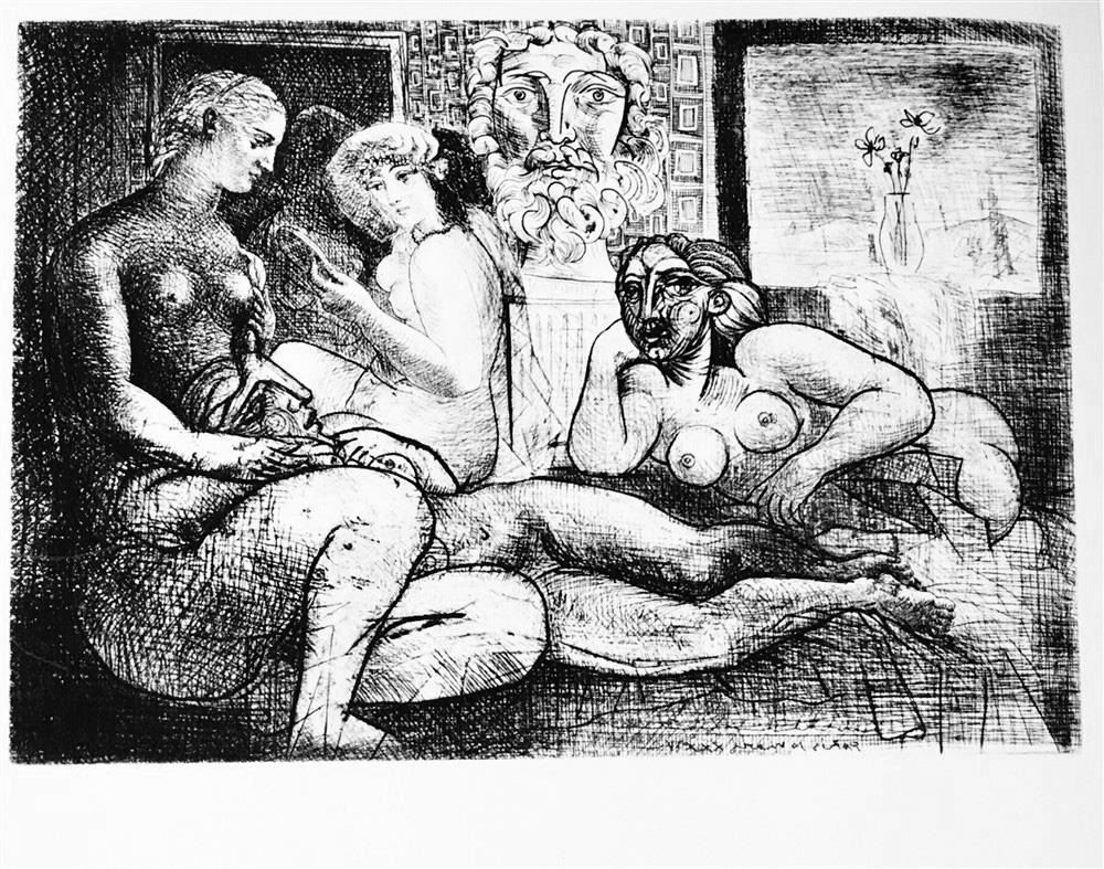 Artist Name: Pablo Picasso | Title of Art: (Plate Seventy Two ) Four Nude Models and a Sculptured Head c. 1934 | Medium: High Quality Double-Sided Fine Art Book Plate | Unsigned | Image Size: Approx 7 x 9 | Paper Size 11 x 8 | Offered Unframed: Framing presentation if shown is for concept only | If you need assistance with custom framing, call the experts at ArtForSale | Circa 1955 | Published in Germany by Verlag Gerd Hatje, Stuttgart. Printed in Germany and Switzerland
