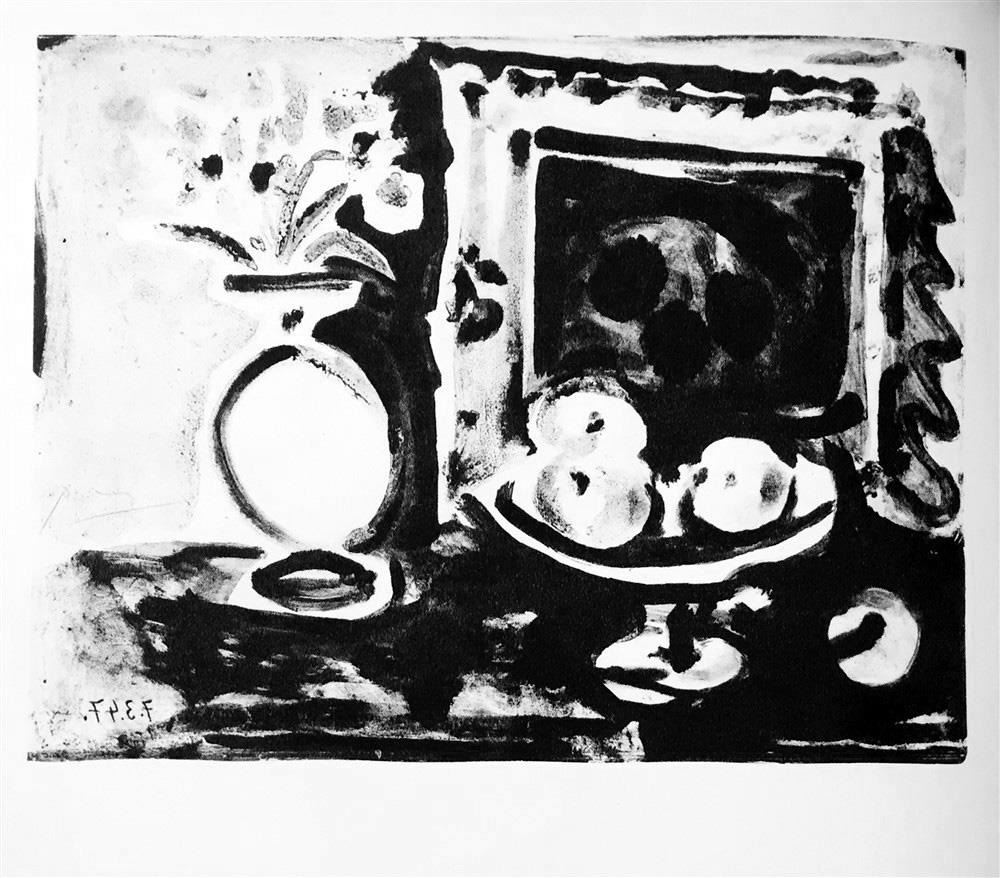 Artist Name: Pablo Picasso | Title of Art: (Plate One Hundred Twenty Eight) Large Still Life with Fruit bowl c. 1947 | Medium: High Quality Double-Sided Fine Art Book Plate | Signed in Plate | Image Size: Approx 7 x 8 | Paper Size 11 x 8 | Offered Unframed: Framing presentation if shown is for concept only | If you need assistance with custom framing, call the experts at ArtForSale | Circa 1955 | Published in Germany by Verlag Gerd Hatje, Stuttgart. Printed in Germany and Switzerland