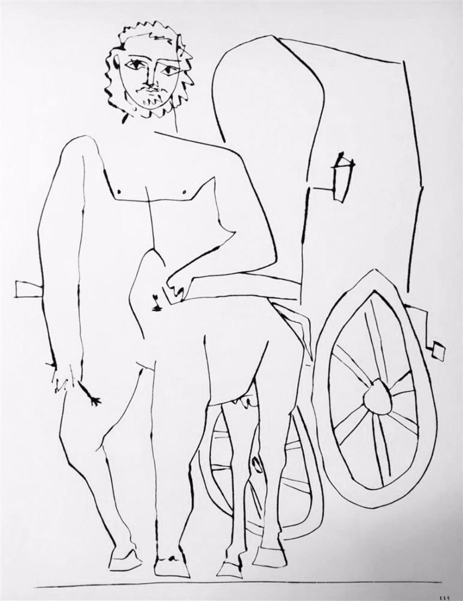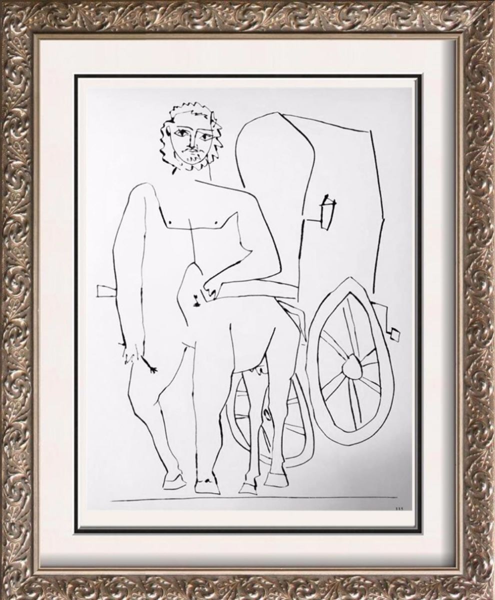 Artist Name: Pablo Picasso | Title of Art: (Plate One Hundred Fifteen ) Le Centaure Picador c. 1948 | Medium: High Quality Double-Sided Fine Art Book Plate | Unsigned | Image Size: Approx 10 x 9 | Paper Size 11 x 8 | Offered Unframed: Framing presentation if shown is for concept only | If you need assistance with custom framing, call the experts at ArtForSale | Circa 1955 | Published in Germany by Verlag Gerd Hatje, Stuttgart. Printed in Germany and Switzerland