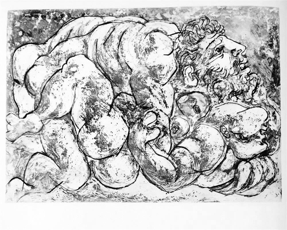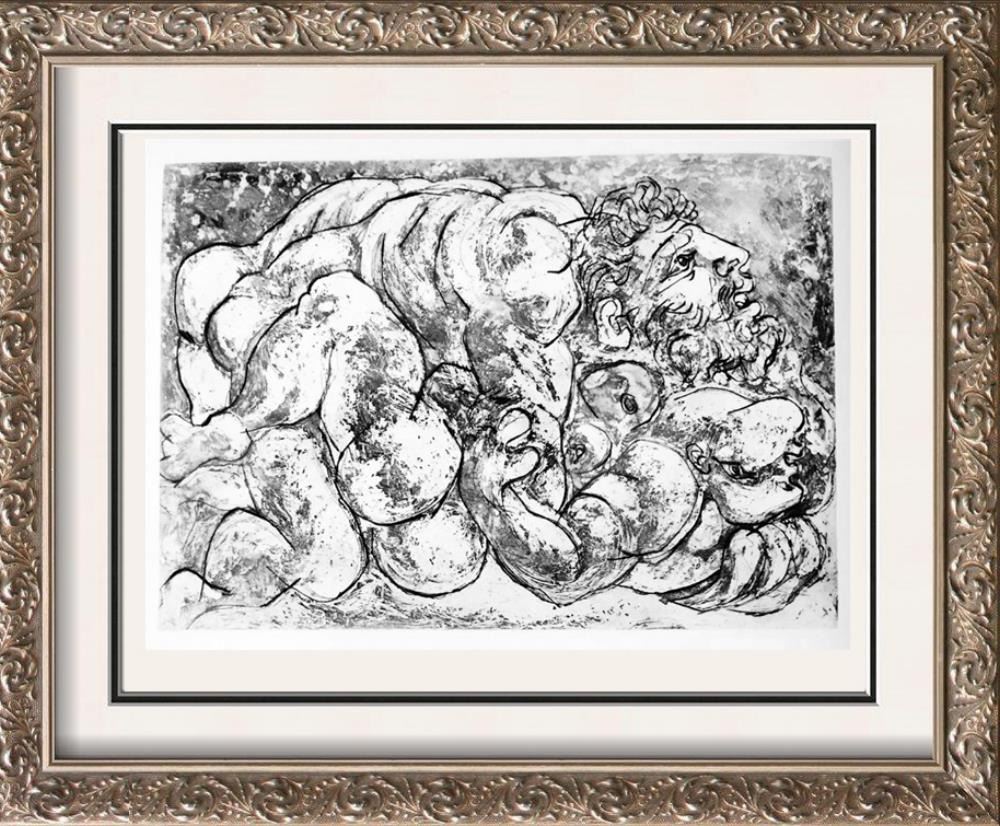 Artist Name: Pablo Picasso | Title of Art: (Plate Ninety) Man and Woman c. 1933 | Medium: High Quality Double-Sided Fine Art Book Plate | Unsigned | Image Size: Approx 7 x 8 | Paper Size 11 x 8 | Offered Unframed: Framing presentation if shown is for concept only | If you need assistance with custom framing, call the experts at ArtForSale | Circa 1955 | Published in Germany by Verlag Gerd Hatje, Stuttgart. Printed in Germany and Switzerland