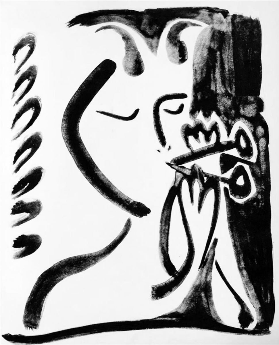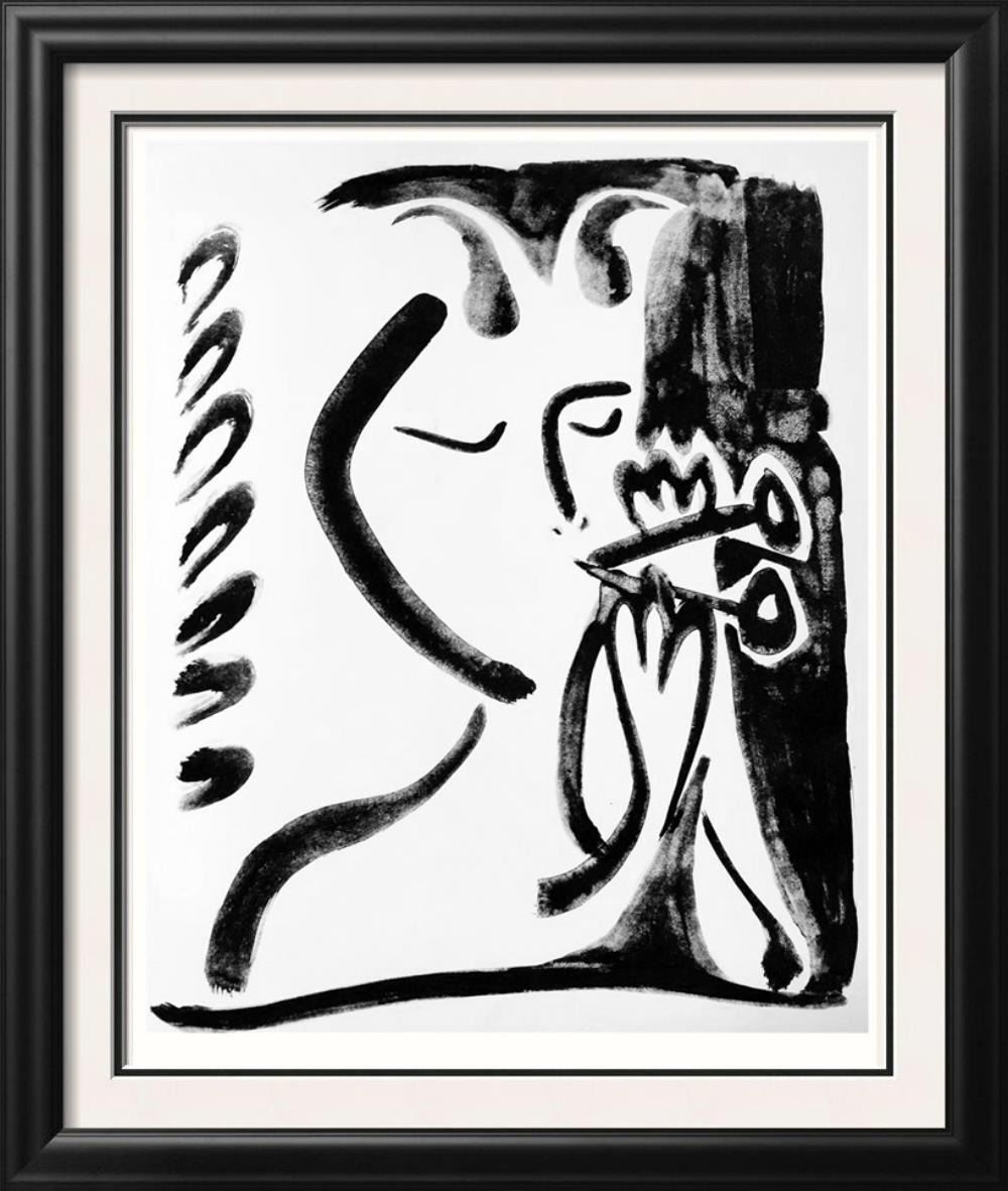 Artist Name: Pablo Picasso | Title of Art: (Plate One Hundred Thirty Three) Musical Faun III c. 1948 | Medium: High Quality Double-Sided Fine Art Book Plate | Unsigned | Image Size: Approx 10 x 8 | Paper Size 11 x 8 | Offered Unframed: Framing presentation if shown is for concept only | If you need assistance with custom framing, call the experts at ArtForSale | Circa 1955 | Published in Germany by Verlag Gerd Hatje, Stuttgart. Printed in Germany and Switzerland