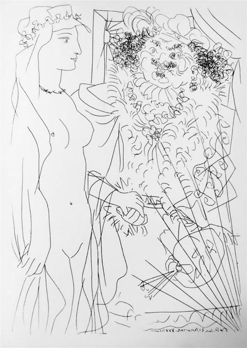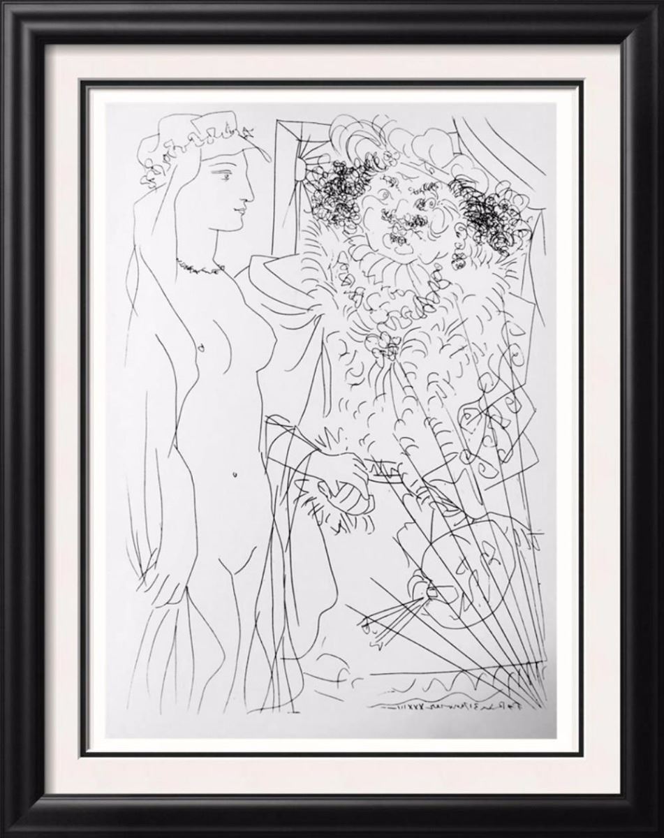 Artist Name: Pablo Picasso | Title of Art: (Plate Seventy Seven ) Nude and Self-Portrait of Rembrandt c. 1933 | Medium: High Quality Double-Sided Fine Art Book Plate | Unsigned | Image Size: Approx 10 x 8 | Paper Size 11 x 8 | Offered Unframed: Framing presentation if shown is for concept only | If you need assistance with custom framing, call the experts at ArtForSale | Circa 1955 | Published in Germany by Verlag Gerd Hatje, Stuttgart. Printed in Germany and Switzerland