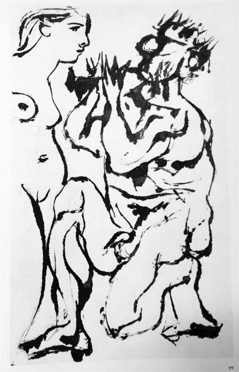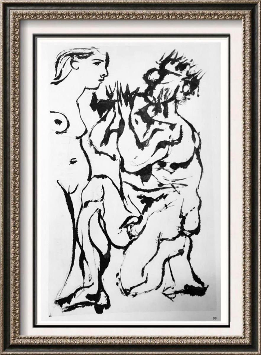 Artist Name: Pablo Picasso | Title of Art: (Plate Ninety Nine ) Pan Plays to a Standing Woman c. 1933-34 | Medium: High Quality Double-Sided Fine Art Book Plate | Unsigned | Image Size: Approx 10 x 7 | Paper Size 11 x 8 | Offered Unframed: Framing presentation if shown is for concept only | If you need assistance with custom framing, call the experts at ArtForSale | Circa 1955 | Published in Germany by Verlag Gerd Hatje, Stuttgart. Printed in Germany and Switzerland