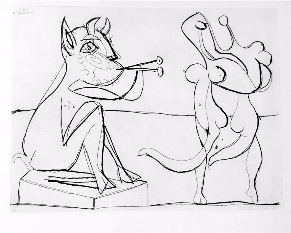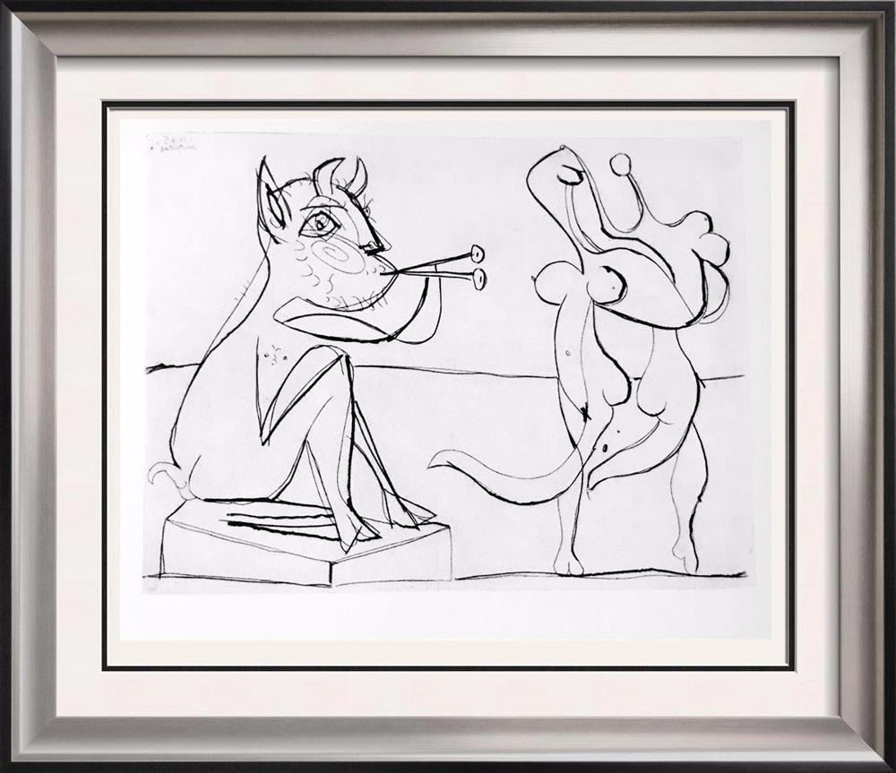 Artist Name: Pablo Picasso | Title of Art: (Plate One Hundred Seven ) Pan and Two Dancers c. 1945 | Medium: High Quality Double-Sided Fine Art Book Plate | Unsigned | Image Size: Approx 7 x 8 | Paper Size 11 x 8 | Offered Unframed: Framing presentation if shown is for concept only | If you need assistance with custom framing, call the experts at ArtForSale | Circa 1955 | Published in Germany by Verlag Gerd Hatje, Stuttgart. Printed in Germany and Switzerland