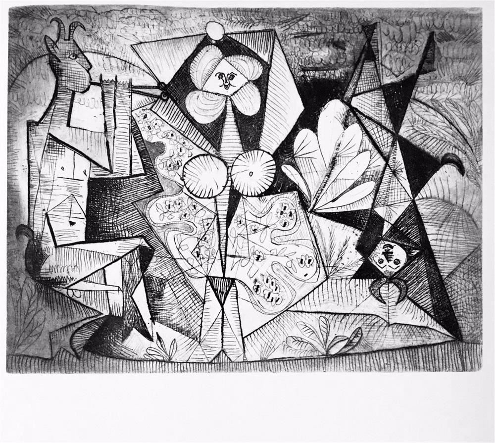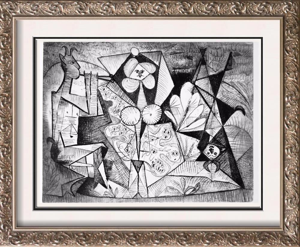 Artist Name: Pablo Picasso | Title of Art: (Plate One Hundred Thirteen ) Pastoral c. 1946 | Medium: High Quality Double-Sided Fine Art Book Plate | Unsigned | Image Size: Approx 7 x 8 | Paper Size 11 x 8 | Offered Unframed: Framing presentation if shown is for concept only | If you need assistance with custom framing, call the experts at ArtForSale | Circa 1955 | Published in Germany by Verlag Gerd Hatje, Stuttgart. Printed in Germany and Switzerland