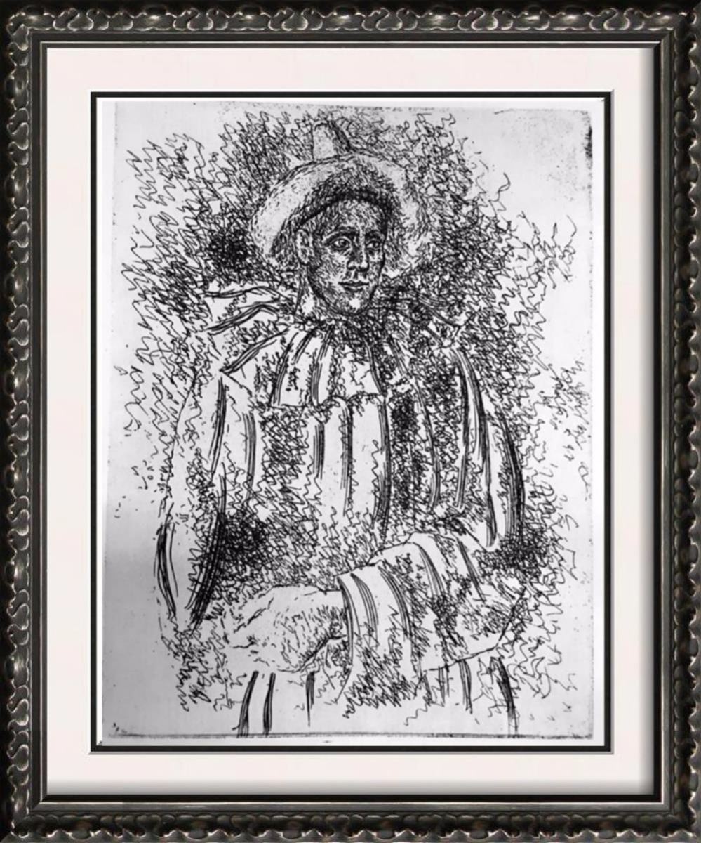 Artist Name: Pablo Picasso | Title of Art: (Plate Nineteen) Pierrot c. 1918 | Medium: High Quality Double-Sided Fine Art Book Plate | Unsigned | Image Size is Same Size as Original: Approx 7 x 5 | Paper Size 11 x 8 | Offered Unframed: Framing presentation if shown is for concept only | If you need assistance with custom framing, call the experts at ArtForSale | Circa 1955 | Published in Germany by Verlag Gerd Hatje, Stuttgart. Printed in Germany and Switzerland