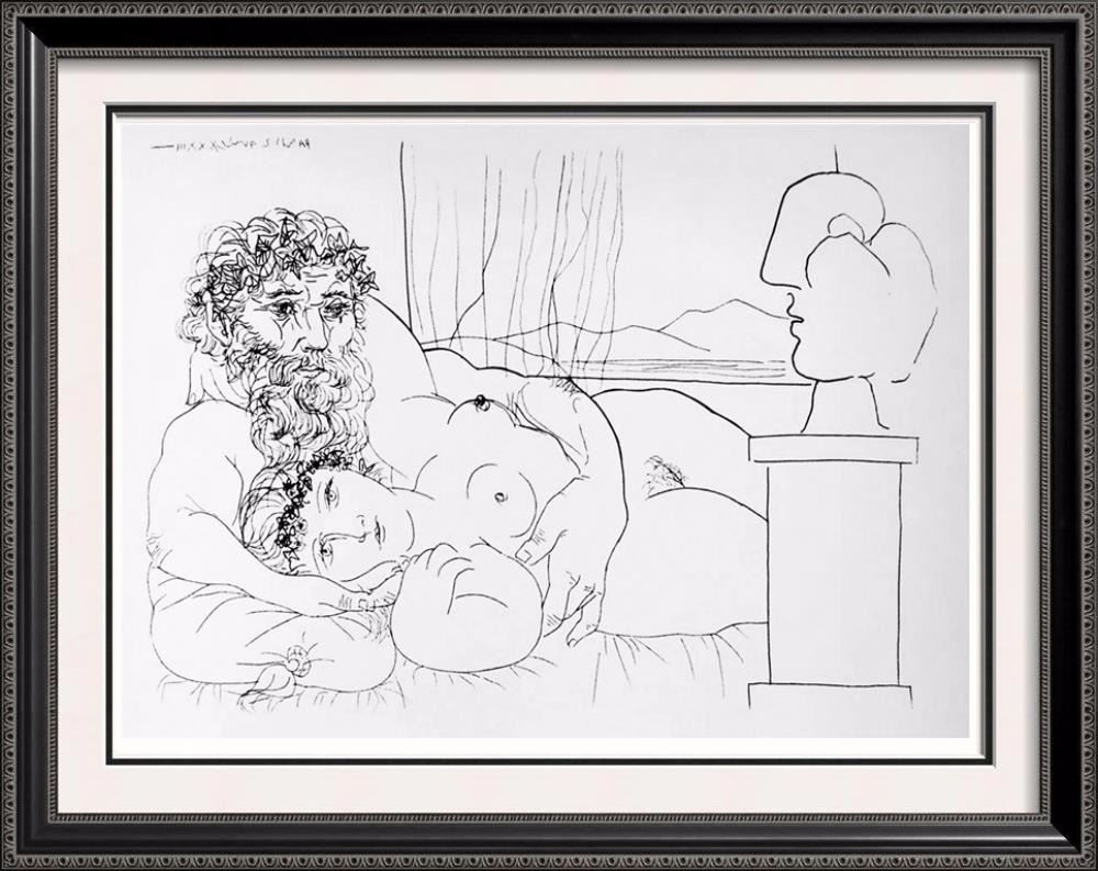 Artist Name: Pablo Picasso | Title of Art: (Plate Fifty Nine ) Sculptor's Repose c. 1933 | Medium: High Quality Double-Sided Fine Art Book Plate | Unsigned | Image Size: Approx 7 x 8 | Paper Size 11 x 8 | Offered Unframed: Framing presentation if shown is for concept only | If you need assistance with custom framing, call the experts at ArtForSale | Circa 1955 | Published in Germany by Verlag Gerd Hatje, Stuttgart. Printed in Germany and Switzerland