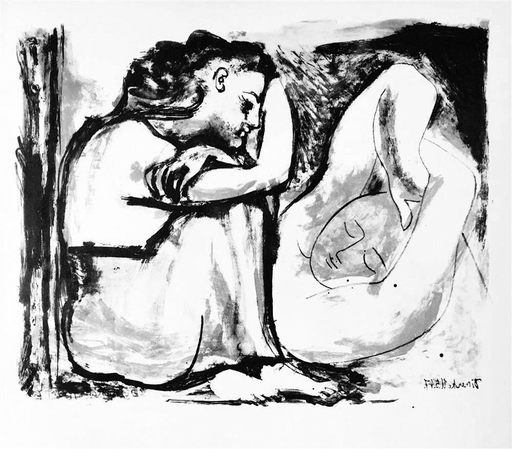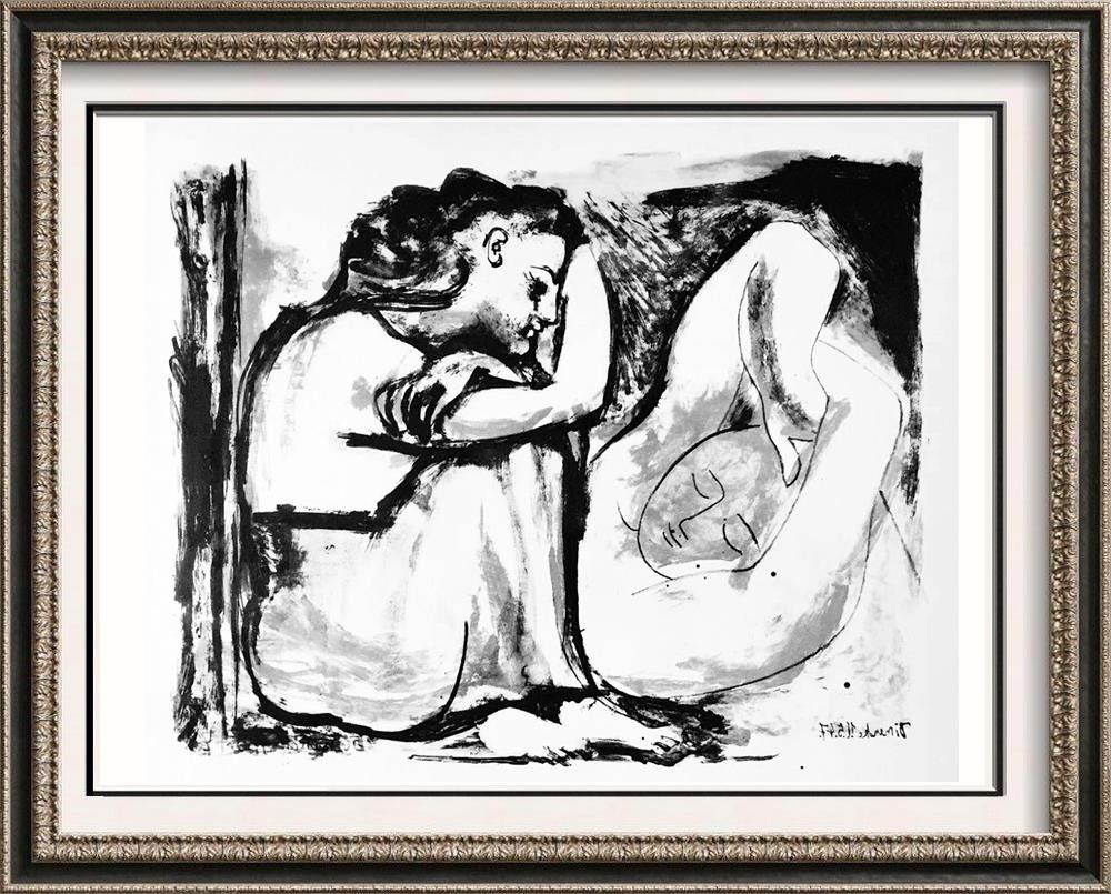 Artist Name: Pablo Picasso | Title of Art: (Plate One Hundred Twenty Nine) Seated Woman and Sleeping Woman c. 1947 | Medium: High Quality Double-Sided Fine Art Book Plate | Unsigned | Image Size: Approx 7 x 8 | Paper Size 11 x 8 | Offered Unframed: Framing presentation if shown is for concept only | If you need assistance with custom framing, call the experts at ArtForSale | Circa 1955 | Published in Germany by Verlag Gerd Hatje, Stuttgart. Printed in Germany and Switzerland