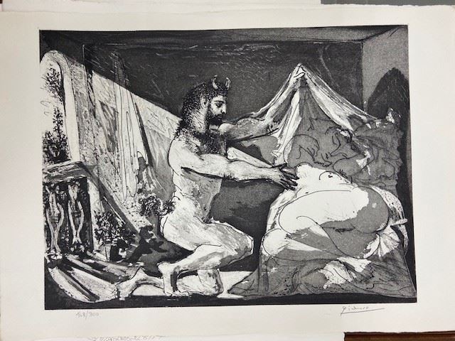 Picasso's "Faune devoilant une Femme" is printed on soft fine art paper this delicate 18x13" VOLLARD etching from 1936 is Estate signed but numbered 168/300 in pencil Pablo Picasso created the Suite Vollard between 1930 and 1939 in honor of his friend and art dealer, Ambroise Vollard. The suite is comprised of 100 etchings, illustrating Picasso's most famous themes. In 1990, the Picasso family authorized an unprecedented print recreation, faithfully rendered, of these exceptional artworks. This authorized recreation, produced in a limited edition of 300, was published by the prestigious German Museum, Stadtichen Mulheim an der Ruhr. The paper used for this edition is the same rare, high quality paper used by Picasso to print the Suite Vollard during the 1930's.