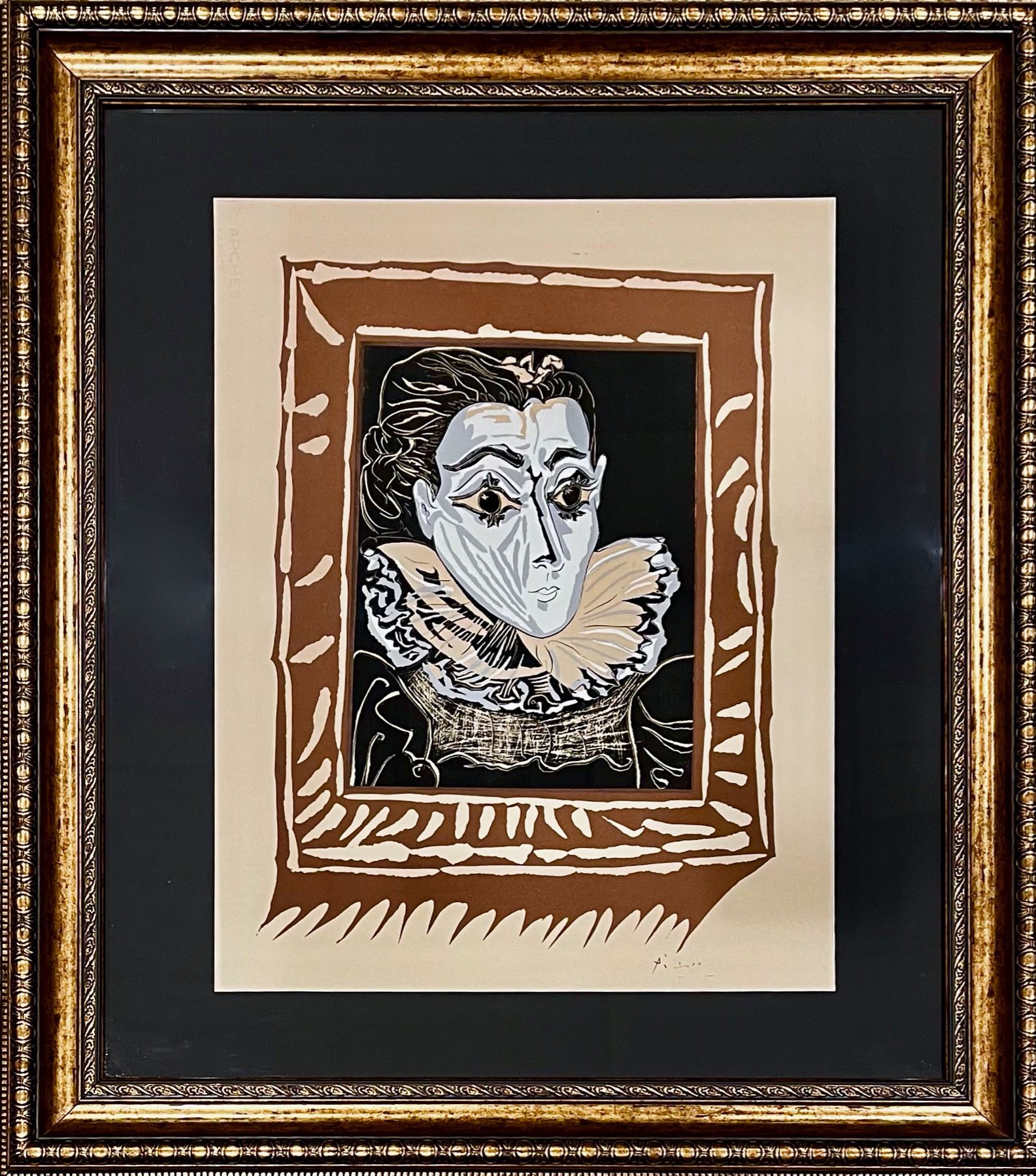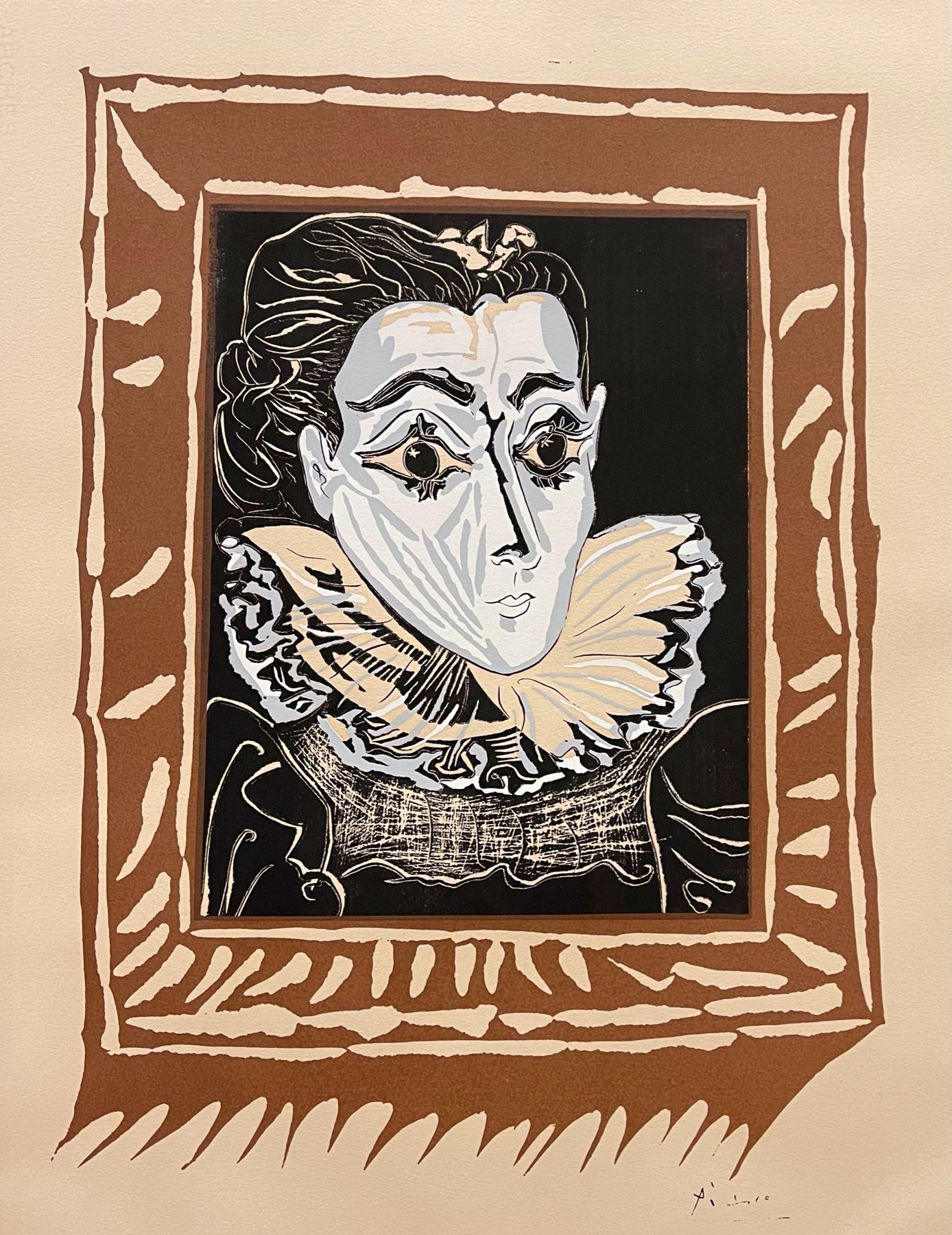 Pablo Picasso (1881-1973) Color lithograph on Arches paper, "La Femme a la Fraise" (Lady with a Ruff) printer, publisher Mourlot, 1963. Signed in the plate, bottom right. Sheet 22 x 16.5 in, by sight, framed 36 x 32 inches. Sheet and frame in excellent condition.