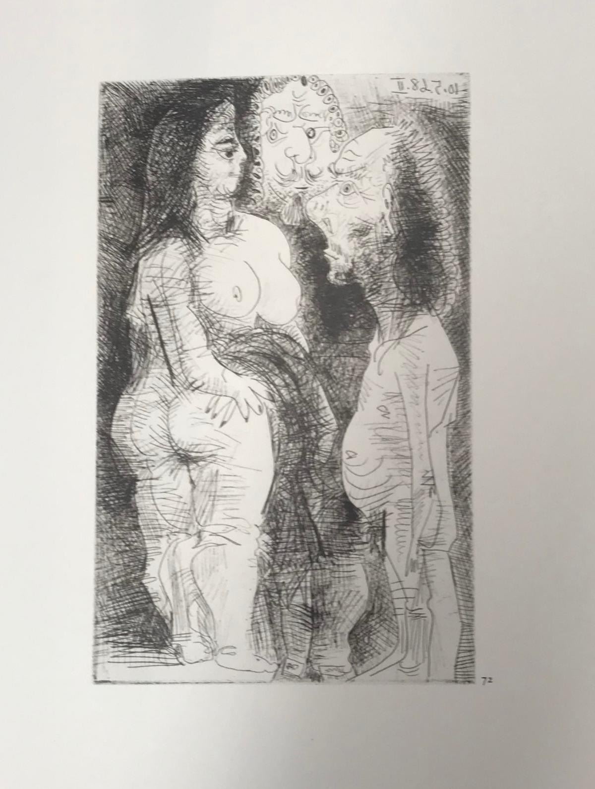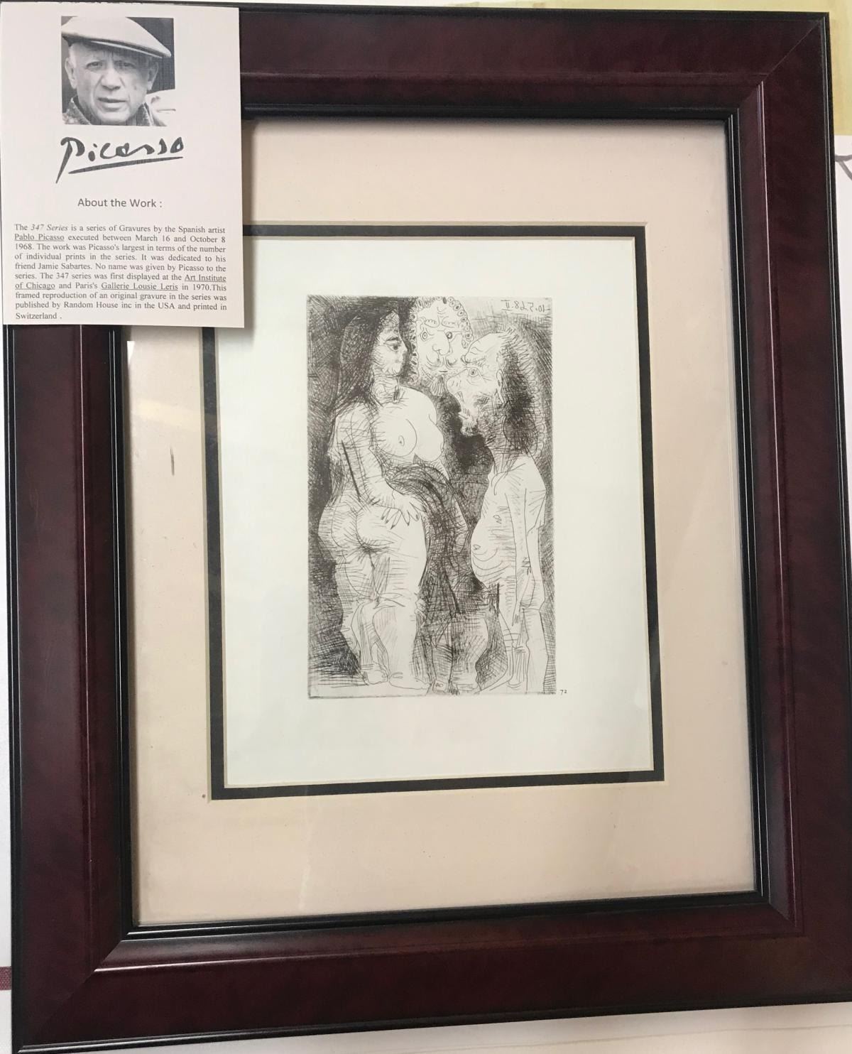The 347 Series is a series of Gravures by the Spanish artist Pablo Picasso executed between March 16 and October 8 1968. The work was Picasso's largest in terms of the number of individual prints in the series. It was dedicated to his friend Jamie Sabartes. No name was given by Picasso to the series. The 347 series was first displayed at the Art Institute of Chicago and Paris's Gallerie Lousie Leris in 1970.This framed reproduction of an original gravure in the series was published by Random House inc in the USA and printed in Switzerland . Size: 14x18" framed.