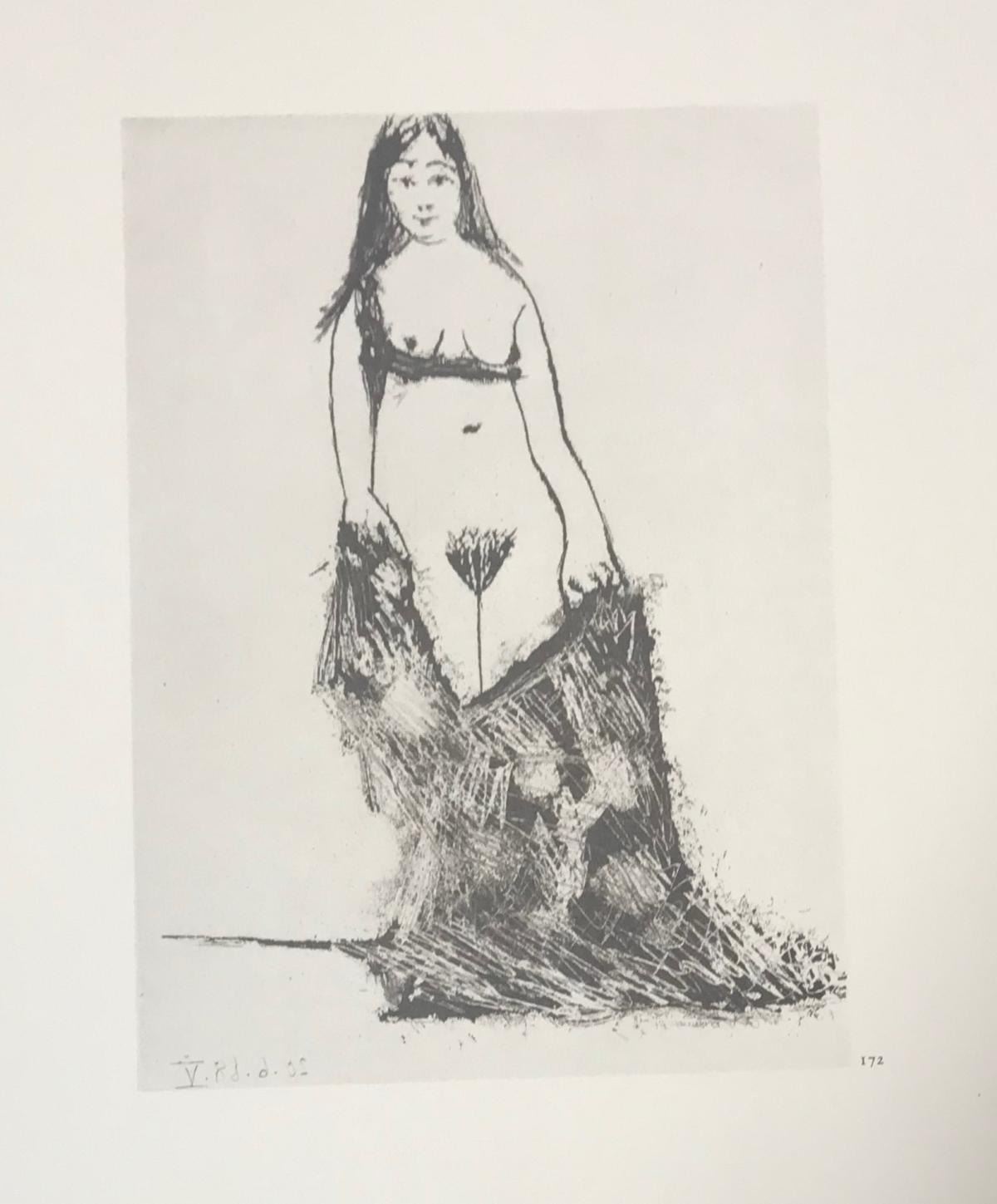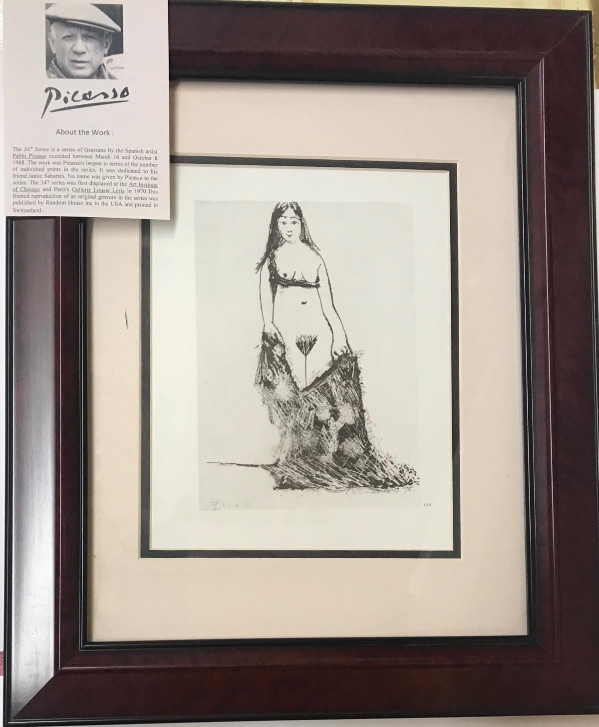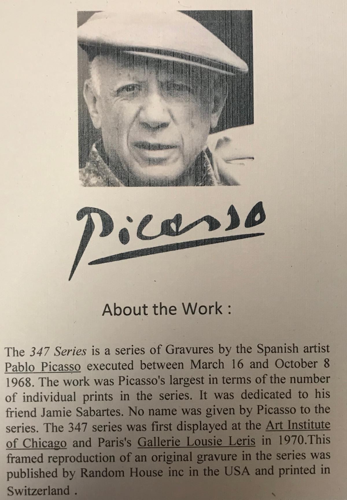 The 347 Series is a series of Gravures by the Spanish artist Pablo Picasso executed between March 16 and October 8 1968. The work was Picasso's largest in terms of the number of individual prints in the series. It was dedicated to his friend Jamie Sabartes. No name was given by Picasso to the series. The 347 series was first displayed at the Art Institute of Chicago and Paris's Gallerie Lousie Leris in 1970.This framed reproduction of an original gravure in the series was published by Random House inc in the USA and printed in Switzerland . Size: 14x18" framed.