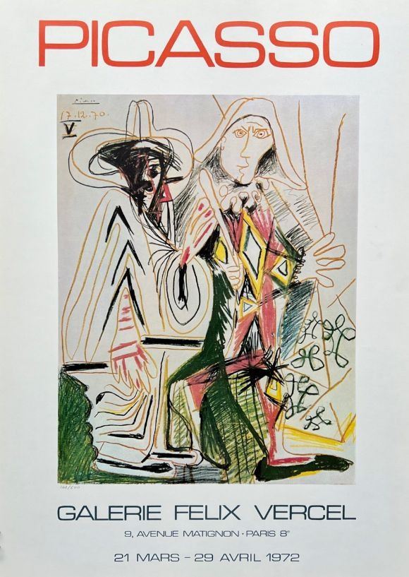 This is a 1972 Pablo Picasso lithograph titled “GALERIE FELIX VERCEL”. This subject is signed in the plate which means that it has a copy of Picasso’s signature on it. Pencil numbered from a limited edition of 500. Paper measures 28 inches x 20 inches. Printed in 1972 on high quality archival paper. Printer is “Michel Boucaut, Paris in 1972” In excellent condition, comes unframed. Comes with a certificate.